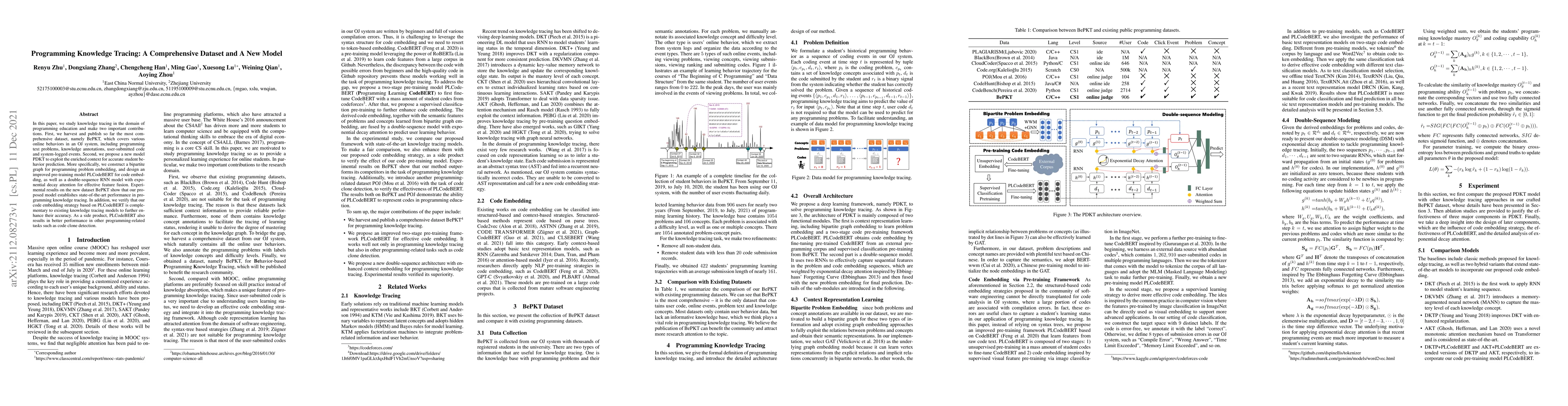 This paper introduces a comprehensive dataset, BePKT, for programming knowledge tracing, and proposes a new model, PDKT, which uses a bipartite graph and an improved pre-training model, PLCodeBERT, for code embedding and a double-sequence RNN with exponential decay attention for feature fusion, achieving state-of-the-art performance.