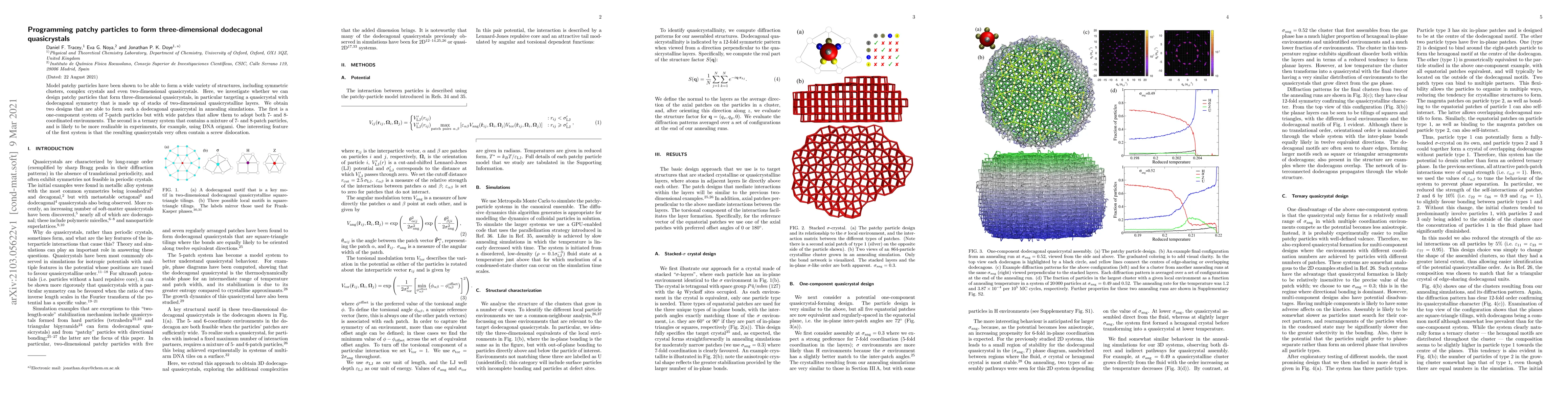 This research explores the design of patchy particles capable of forming three-dimensional dodecagonal quasicrystals, achieving success with both a one-component system and a ternary mixture, with the latter being more feasible for experimental realization. The study highlights the frequent occurrence of screw dislocations in the quasicrystals formed by the first system.