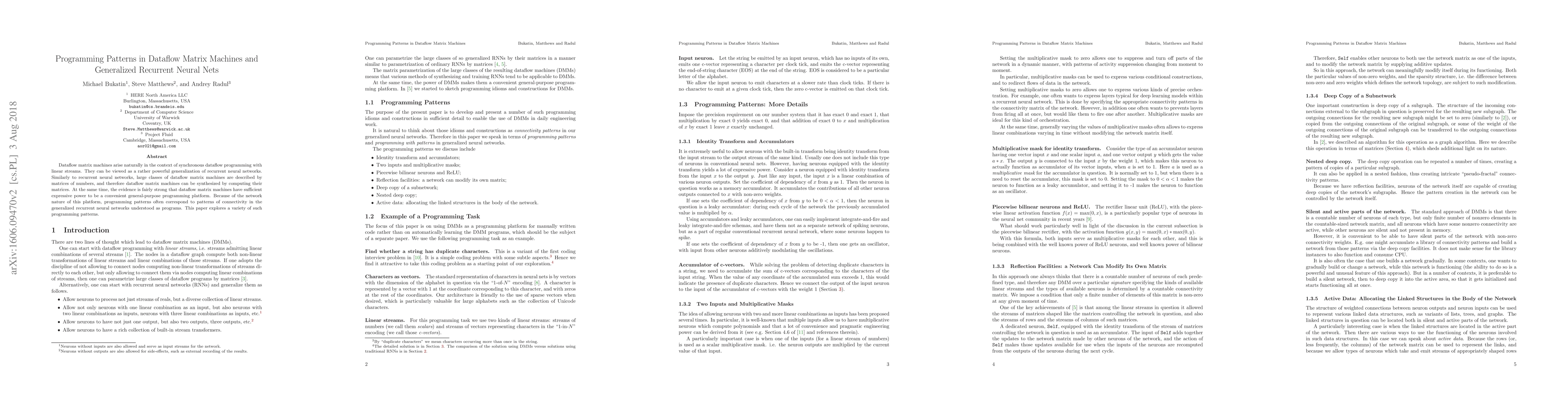This paper examines programming patterns in dataflow matrix machines, which generalize recurrent neural networks and can be synthesized via matrix computations. It investigates how these patterns correspond to connectivity patterns in generalized recurrent neural networks.