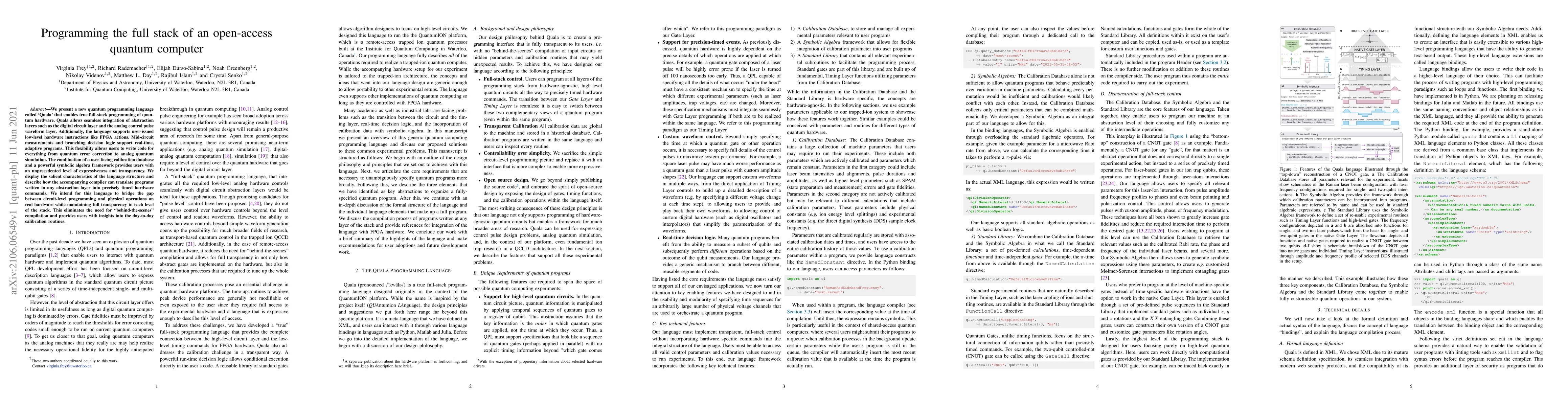 The paper introduces "Quala," a new quantum programming language that facilitates full-stack programming for open-access quantum computers, integrating both digital circuit and analog control layers, and supporting real-time adaptive programs through mid-circuit measurements and branching. The accompanying compiler translates Quala programs into precise hardware commands, bridging circuit-level programming with physical hardware operations while maintaining transparency.