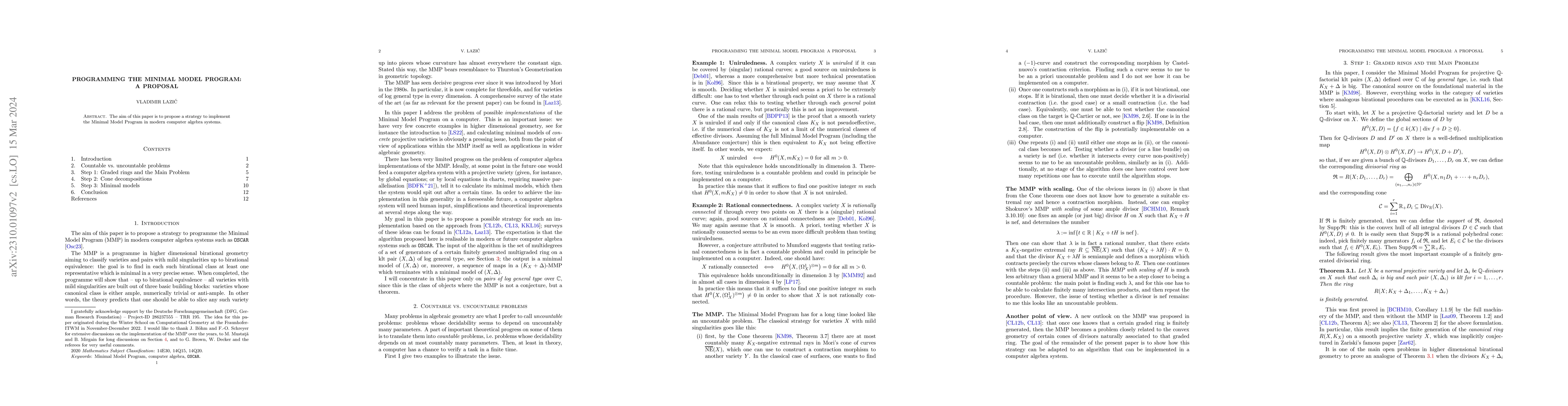The paper proposes a strategy to implement the Minimal Model Program (MMP) in modern computer algebra systems by considering projective Q-factorial klt pairs (X, ∆) of log general type over C, with KX + ∆ being big. It introduces the Main Problem, which involves finding the multidegrees of a set of generators for the divisorial ring R(X; m0(KX + ∆), ..., mr(KX + ∆ + A'r)) for some positive integers mi and effective divisors A'i ≡ Ai.