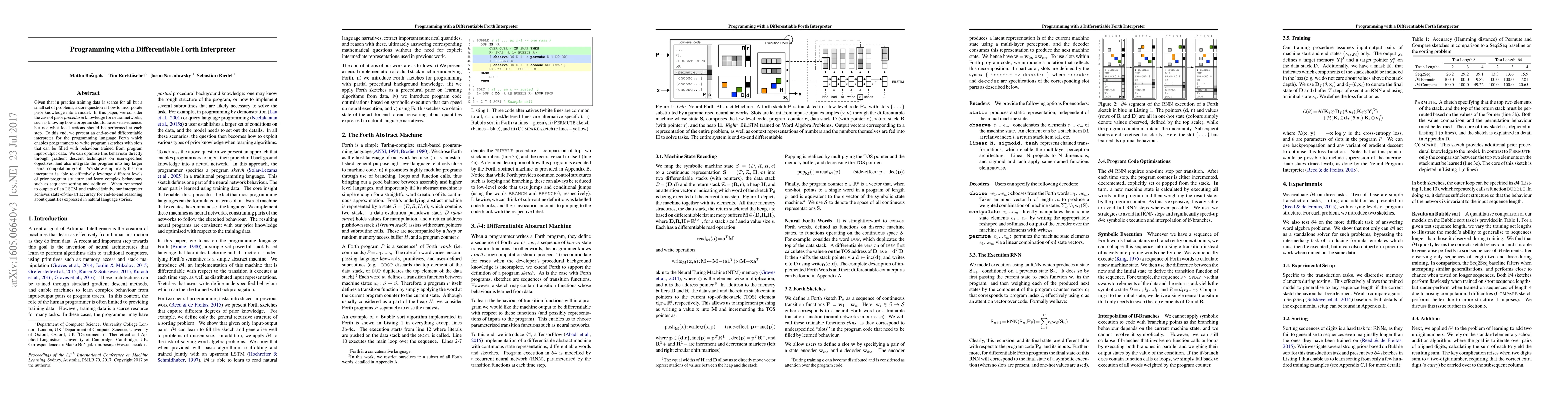 This paper introduces a differentiable Forth interpreter that allows programmers to incorporate procedural prior knowledge into neural networks by writing program sketches with trainable slots. The interpreter optimizes learned behaviors through gradient descent and integrates seamlessly into larger neural computation graphs, achieving state-of-the-art accuracy in end-to-end reasoning tasks.