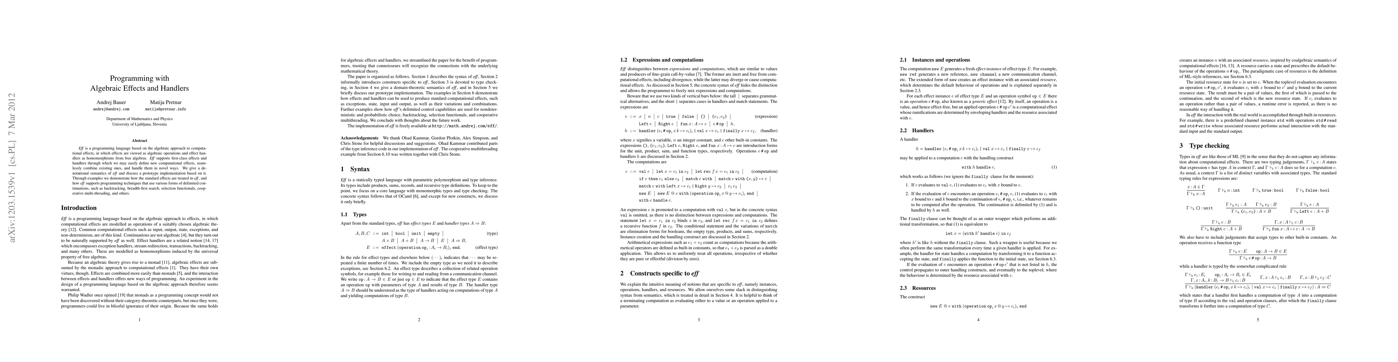 Eff is a programming language designed around algebraic effects and handlers, allowing for first-class effects and flexible handling of computational effects. The paper provides a denotational semantics and discusses a prototype implementation, demonstrating Eff's support for advanced programming techniques involving delimited continuations.