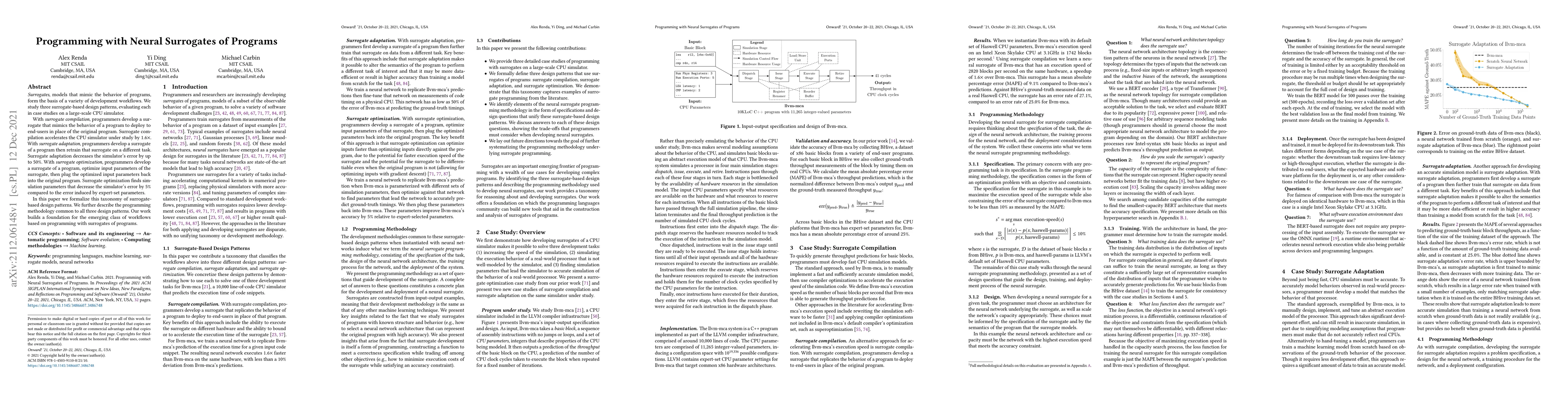 Researchers developed a framework for programming with neural surrogates of programs, which accelerates CPU simulation by up to 50% and improves error reduction by up to 5%. The study formalizes three design patterns: compilation, adaptation, and optimization, providing a foundation for emerging workflows based on surrogate-based design.
