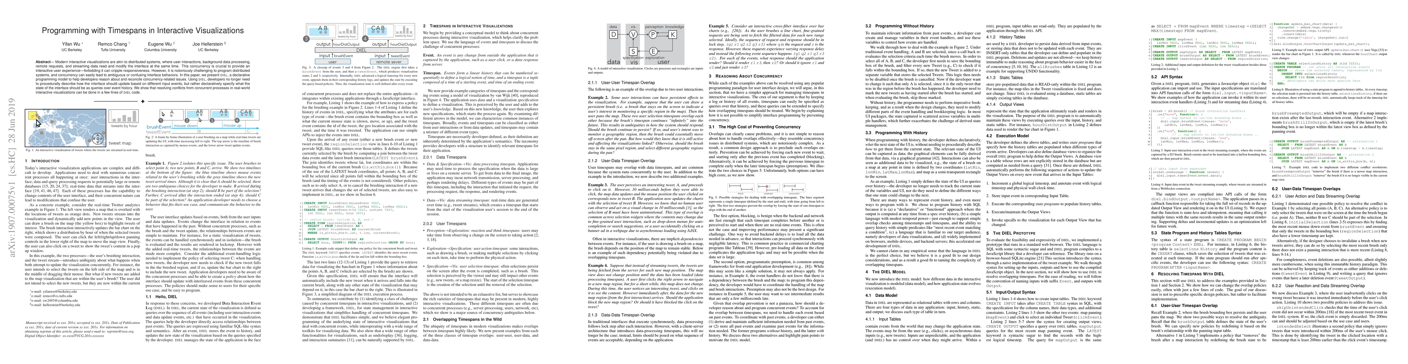 Modern interactive visualizations are akin to distributed systems, where user interactions, background data processing, remote requests, and streaming data read and modify the interface at the same time. This concurrency is crucial to provide an interactive user experience---forbidding it can cripple responsiveness. However, it is notoriously challenging to program distributed systems, and concurrency can easily lead to ambiguous or confusing interface behaviors. In this paper, we present DIEL, a declarative programming model to help developers reason about and reconcile concurrency-related issues. Using DIEL, developers no longer need to procedurally describe how the interface should update based on different input events, but rather declaratively specify what the state of the interface should be as queries over event history. We show that resolving conflicts from concurrent processes in real-world interactive visualizations can be done in a few lines of DIEL code.
