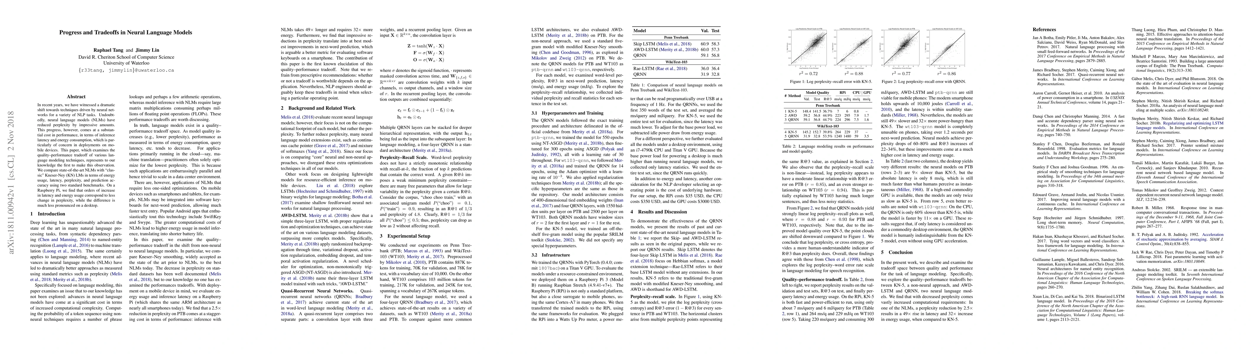 In recent years, we have witnessed a dramatic shift towards techniques driven by neural networks for a variety of NLP tasks. Undoubtedly, neural language models (NLMs) have reduced perplexity by impressive amounts. This progress, however, comes at a substantial cost in performance, in terms of inference latency and energy consumption, which is particularly of concern in deployments on mobile devices. This paper, which examines the quality-performance tradeoff of various language modeling techniques, represents to our knowledge the first to make this observation. We compare state-of-the-art NLMs with "classic" Kneser-Ney (KN) LMs in terms of energy usage, latency, perplexity, and prediction accuracy using two standard benchmarks. On a Raspberry Pi, we find that orders of increase in latency and energy usage correspond to less change in perplexity, while the difference is much less pronounced on a desktop.
