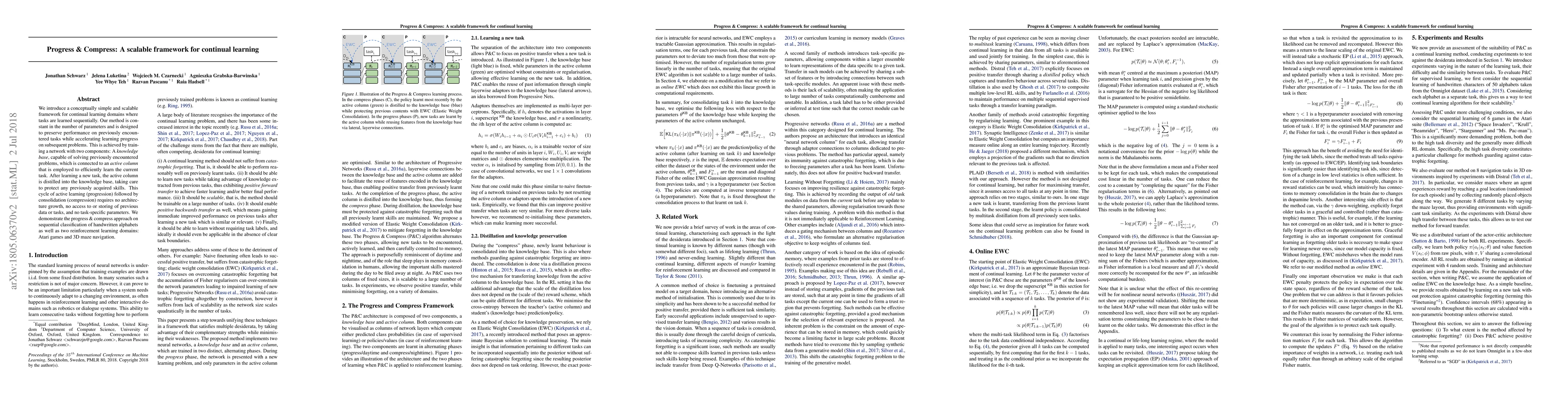 We introduce a conceptually simple and scalable framework for continual learning domains where tasks are learned sequentially. Our method is constant in the number of parameters and is designed to preserve performance on previously encountered tasks while accelerating learning progress on subsequent problems. This is achieved by training a network with two components: A knowledge base, capable of solving previously encountered problems, which is connected to an active column that is employed to efficiently learn the current task. After learning a new task, the active column is distilled into the knowledge base, taking care to protect any previously acquired skills. This cycle of active learning (progression) followed by consolidation (compression) requires no architecture growth, no access to or storing of previous data or tasks, and no task-specific parameters. We demonstrate the progress & compress approach on sequential classification of handwritten alphabets as well as two reinforcement learning domains: Atari games and 3D maze navigation.