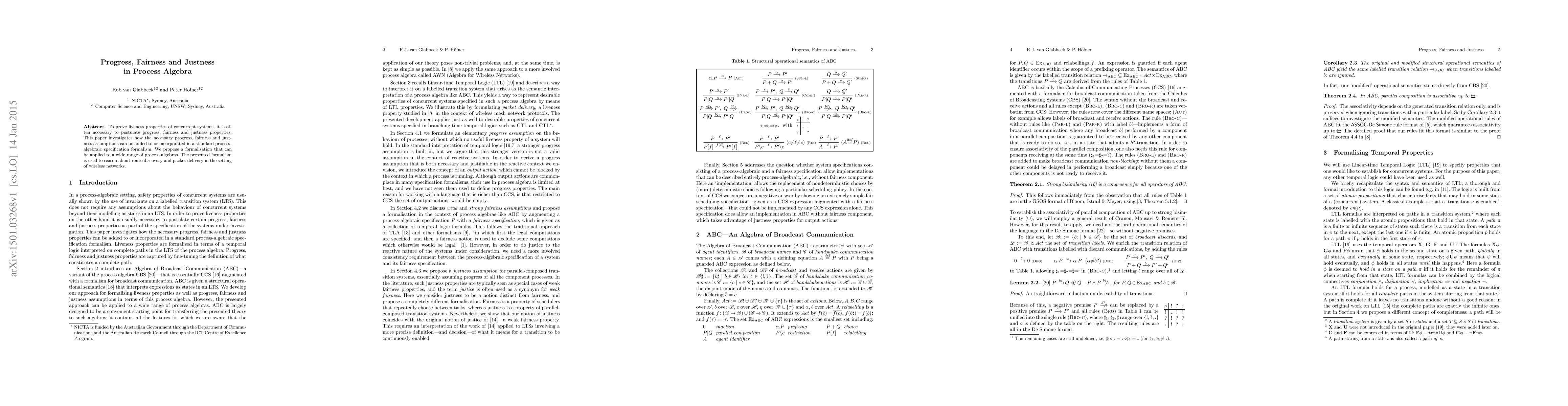 To prove liveness properties of concurrent systems, it is often necessary to postulate progress, fairness and justness properties. This paper investigates how the necessary progress, fairness and justness assumptions can be added to or incorporated in a standard process-algebraic specification formalism. We propose a formalisation that can be applied to a wide range of process algebras. The presented formalism is used to reason about route discovery and packet delivery in the setting of wireless networks.