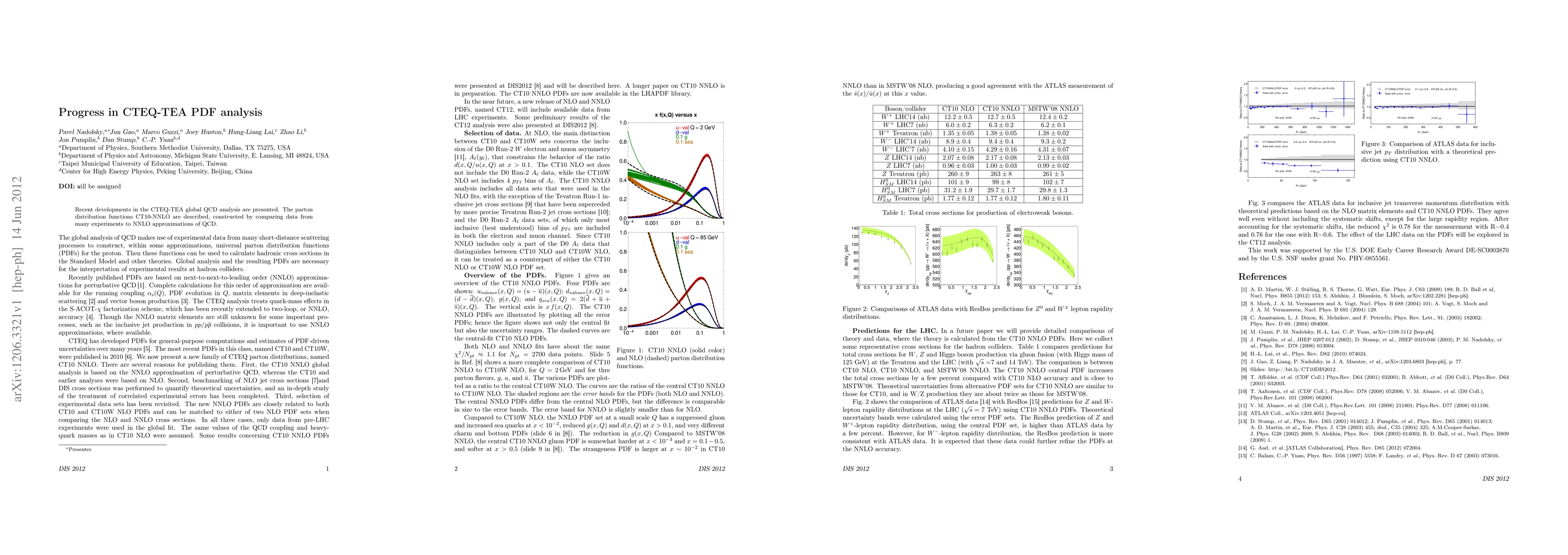Recent developments in the CTEQ-TEA global QCD analysis are presented. The parton distribution functions CT10-NNLO are described, constructed by comparing data from many experiments to NNLO approximations of QCD.