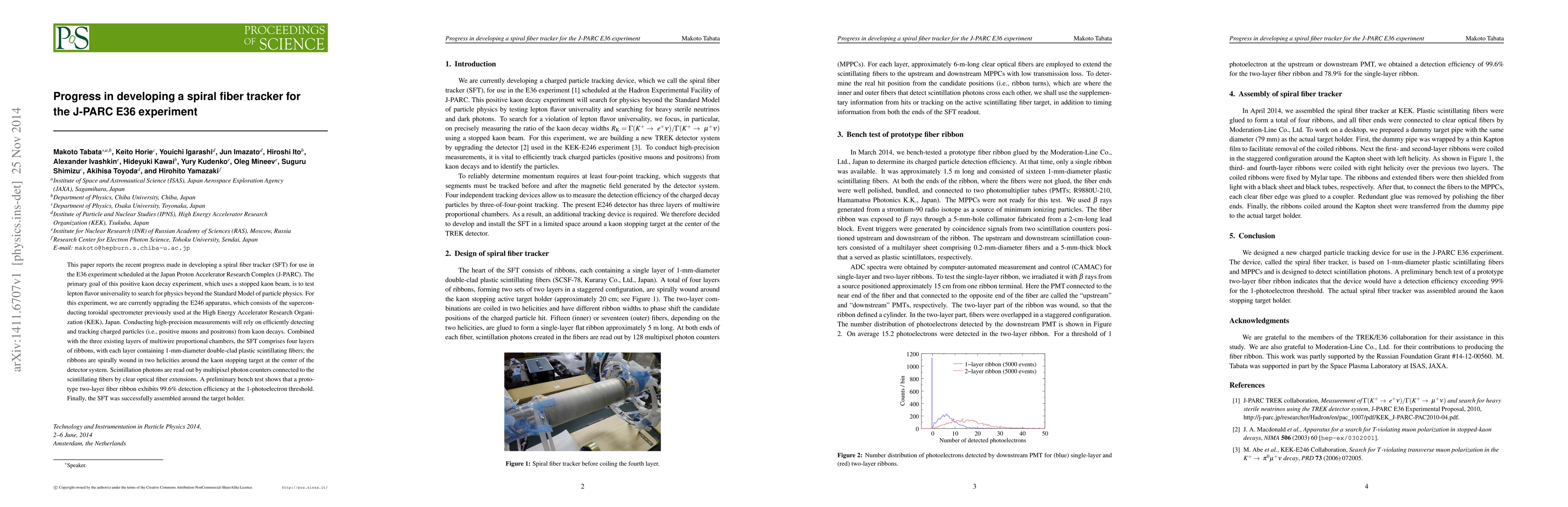 This paper reports the recent progress made in developing a spiral fiber tracker (SFT) for use in the E36 experiment scheduled at the Japan Proton Accelerator Research Complex (J-PARC). The primary goal of this positive kaon decay experiment, which uses a stopped kaon beam, is to test lepton flavor universality to search for physics beyond the Standard Model of particle physics. For this experiment, we are currently upgrading the E246 apparatus, which consists of the superconducting toroidal spectrometer previously used at the High Energy Accelerator Research Organization (KEK), Japan. Conducting high-precision measurements will rely on efficiently detecting and tracking charged particles (i.e., positive muons and positrons) from kaon decays. Combined with the three existing layers of multiwire proportional chambers, the SFT comprises four layers of ribbons, with each layer containing 1-mm-diameter double-clad plastic scintillating fibers; the ribbons are spirally wound in two helicities around the kaon stopping target at the center of the detector system. Scintillation photons are read out by multipixel photon counters connected to the scintillating fibers by clear optical fiber extensions. A preliminary bench test shows that a prototype two-layer fiber ribbon exhibits 99.6% detection efficiency at the 1-photoelectron threshold. Finally, the SFT was successfully assembled around the target holder.