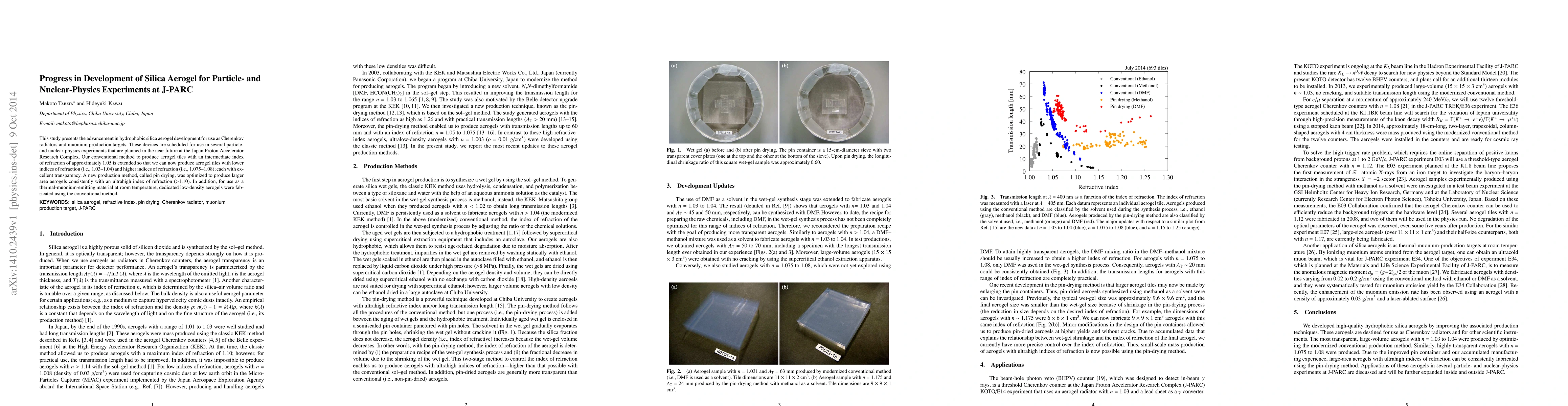 This paper details advancements in hydrophobic silica aerogel production, now capable of lower and higher indices of refraction, optimized for Cherenkov radiators and muonium targets in particle- and nuclear-physics experiments at J-PARC. A new pin drying method enables ultrahigh index aerogels, while low-density aerogels are also developed for thermal-muonium emission.