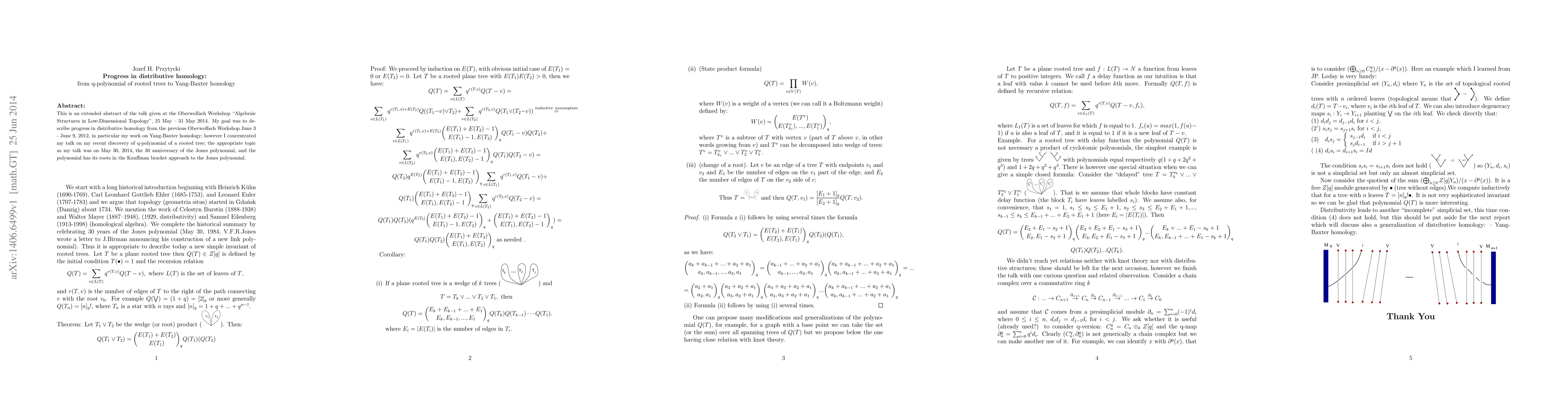 This is an extended abstract of the talk given at the Oberwolfach Workshop "Algebraic Structures in Low-Dimensional Topology", 25 May -- 31 May 2014. My goal was to describe progress in distributive homology from the previous Oberwolfach Workshop June 3 - June 9, 2012, in particular my work on Yang-Baxter homology; however I concentrated my talk on my recent discovery of q-polynomial of a rooted tree; the appropriate topic as my talk was on May 30, 2014, the 30 anniversary of the Jones polynomial, and the polynomial has its roots in the Kauffman bracket approach to the Jones polynomial.
