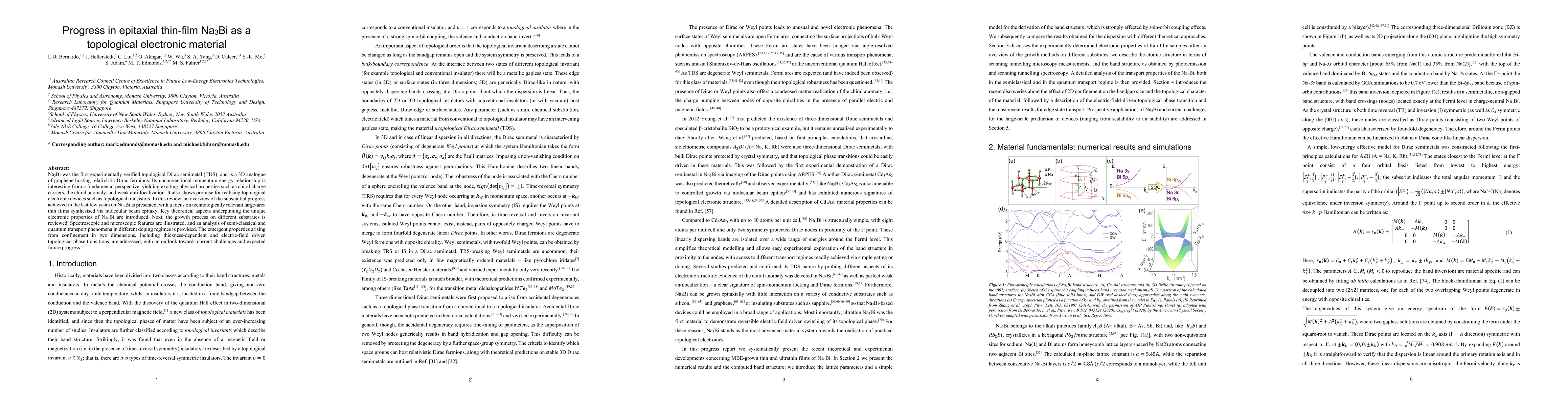 Na3Bi was the first experimentally verified topological Dirac semimetal (TDS), and is a 3D analogue of graphene hosting relativistic Dirac fermions. Its unconventional momentum-energy relationship is interesting from a fundamental perspective, yielding exciting physical properties such as chiral charge carriers, the chiral anomaly, and weak anti-localization. It also shows promise for realising topological electronic devices such as topological transistors. In this review, an overview of the substantial progress achieved in the last few years on Na3Bi is presented, with a focus on technologically relevant large-area thin films synthesised via molecular beam epitaxy. Key theoretical aspects underpinning the unique electronic properties of Na3Bi are introduced. Next, the growth process on different substrates is reviewed. Spectroscopic and microscopic features are illustrated, and an analysis of semi-classical and quantum transport phenomena in different doping regimes is provided. The emergent properties arising from confinement in two dimensions, including thickness-dependent and electric-field driven topological phase transitions, are addressed, with an outlook towards current challenges and expected future progress.