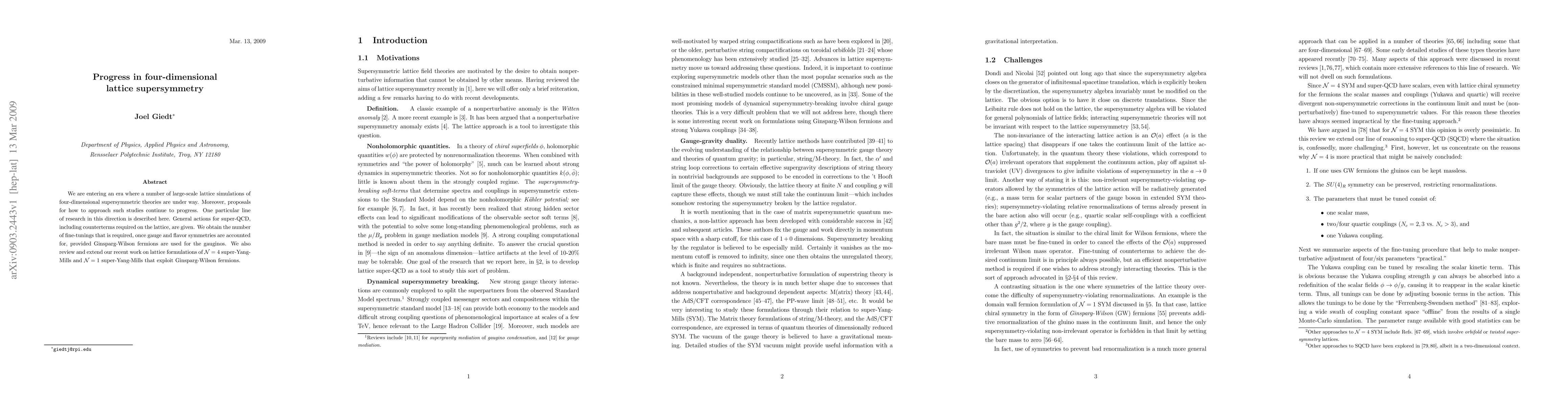 We are entering an era where a number of large-scale lattice simulations of four-dimensional supersymmetric theories are under way. Moreover, proposals for how to approach such studies continue to progress. One particular line of research in this direction is described here. General actions for super-QCD, including counterterms required on the lattice, are given. We obtain the number of fine-tunings that is required, once gauge and flavor symmetries are accounted for, provided Ginsparg-Wilson fermions are used for the gauginos. We also review and extend our recent work on lattice formulations of N=4 super-Yang-Mills and N=1 super-Yang-Mills that exploit Ginsparg-Wilson fermions.