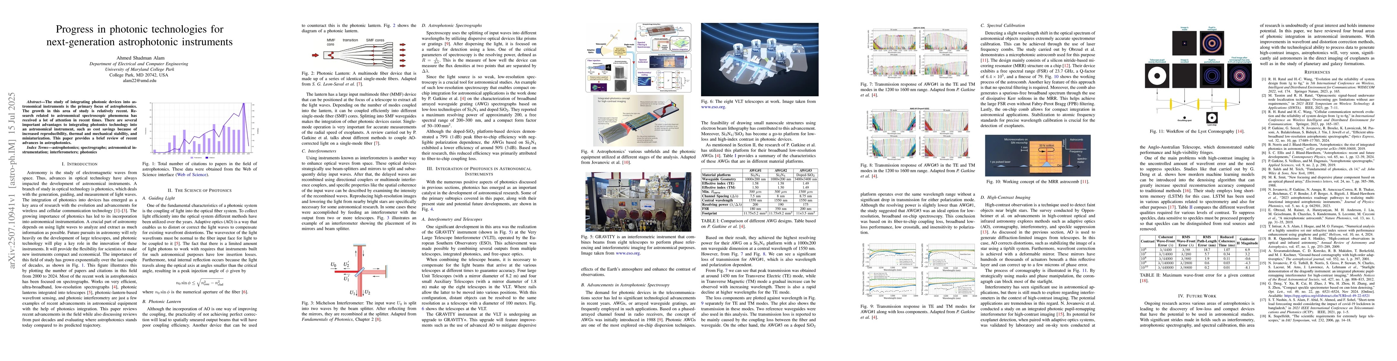 The study of integrating photonic devices into astronomical instruments is the primary focus of astrophotonics. The growth in this area of study is relatively recent. Research related to astronomical spectroscopic phenomena has received a lot of attention in recent times. There are several important advantages to integrating photonics technology into an astronomical instrument, such as cost savings because of increased reproducibility, thermal and mechanical stability, and miniaturization. This paper provides a brief review of recent advances in astrophotonics.