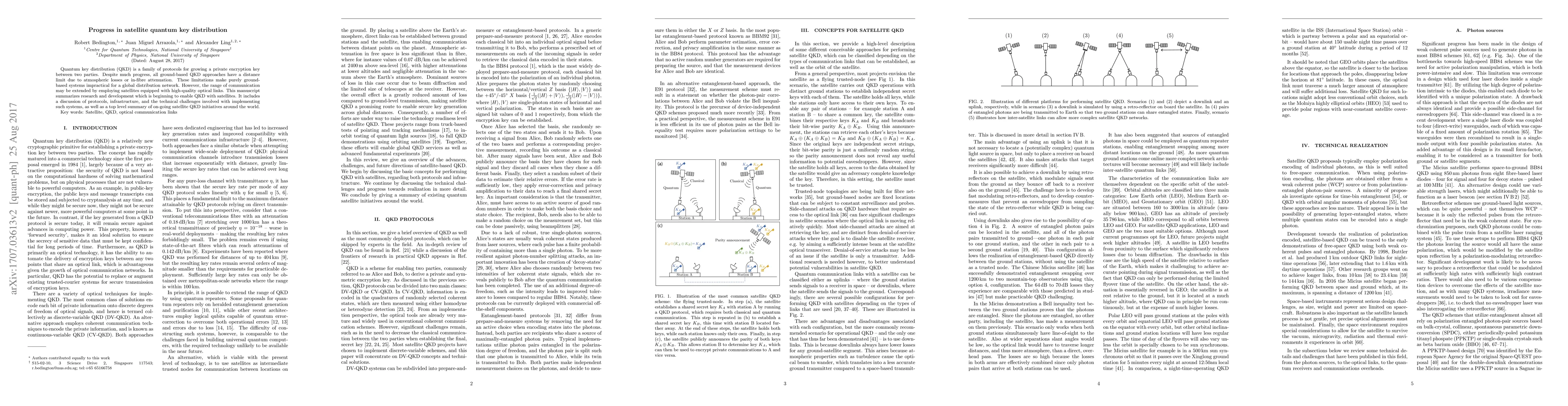 This paper reviews advancements in satellite quantum key distribution (QKD), highlighting protocols, infrastructure, and technical challenges to extend QKD's range beyond ground-based limitations. It also provides an overview of global initiatives in satellite-based QKD.