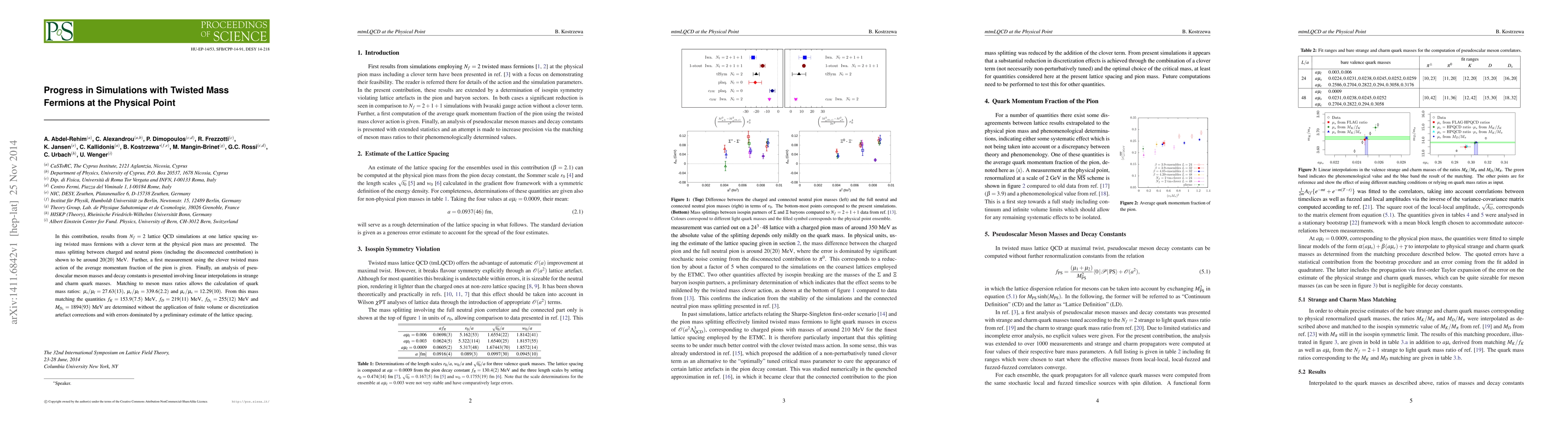 This paper reports on $N_f=2$ lattice QCD simulations using twisted mass fermions at the physical pion mass, revealing a mass splitting of $20(20)~\mathrm{MeV}$ between charged and neutral pions. It also presents initial measurements of the average momentum fraction of pions and analyzes pseudoscalar meson masses and decay constants, determining quark mass ratios and meson decay constants without discretization corrections.