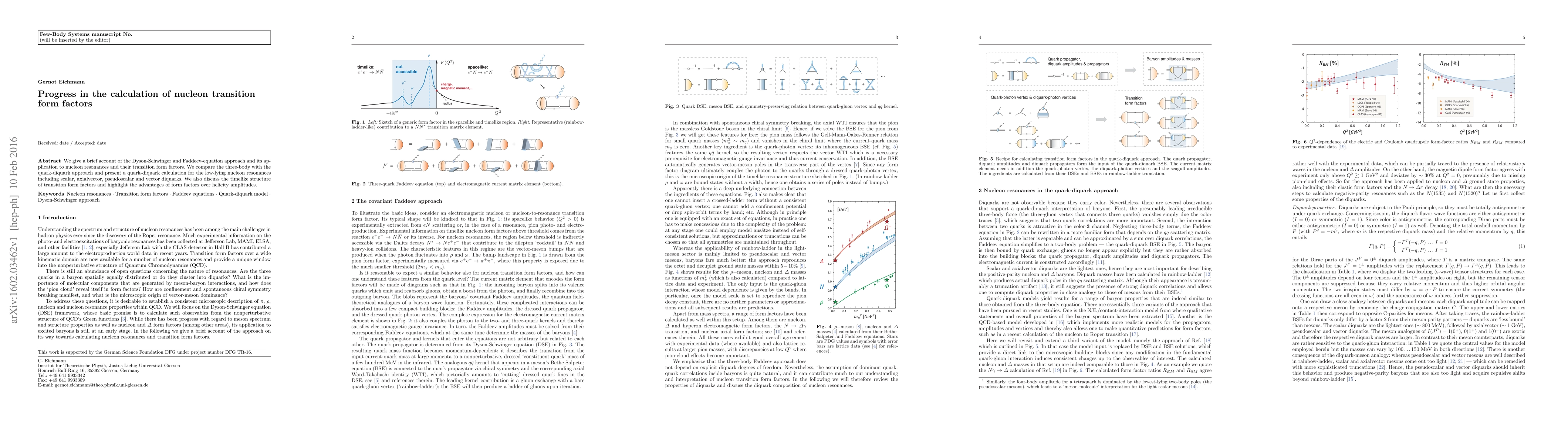 We give a brief account of the Dyson-Schwinger and Faddeev-equation approach and its application to nucleon resonances and their transition form factors. We compare the three-body with the quark-diquark approach and present a quark-diquark calculation for the low-lying nucleon resonances including scalar, axialvector, pseudoscalar and vector diquarks. We also discuss the timelike structure of transition form factors and highlight the advantages of form factors over helicity amplitudes.
