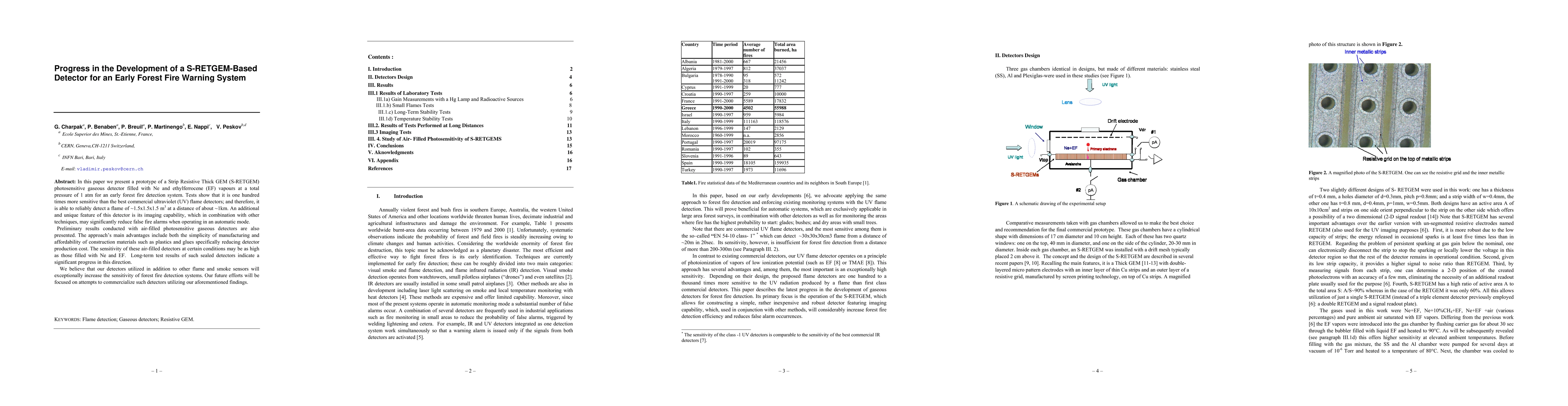 In this paper we present a prototype of a Strip Resistive Thick GEM photosensitive gaseous detector filled with Ne and ethylferrocene vapours at a total pressure of 1 atm for an early forest fire detection system. Tests show that it is one hundred times more sensitive than the best commercial ultraviolet flame detectors and therefore, it is able to reliably detect a flame of 1.5x1.5x1.5 m3 at a distance of about 1km. An additional and unique feature of this detector is its imaging capability, which in combination with other techniques, may significantly reduce false fire alarms when operating in an automatic mode. Preliminary results conducted with air filled photosensitive gaseous detectors are also presented. The approach main advantages include both the simplicity of manufacturing and affordability of construction materials such as plastics and glues specifically reducing detector production cost. The sensitivity of these air filled detectors at certain conditions may be as high as those filled with Ne and EF. Long term test results of such sealed detectors indicate a significant progress in this direction. We believe that our detectors utilized in addition to other flame and smoke sensors will exceptionally increase the sensitivity of forest fire detection systems. Our future efforts will be focused on attempts to commercialize such detectors utilizing our aforementioned findings.