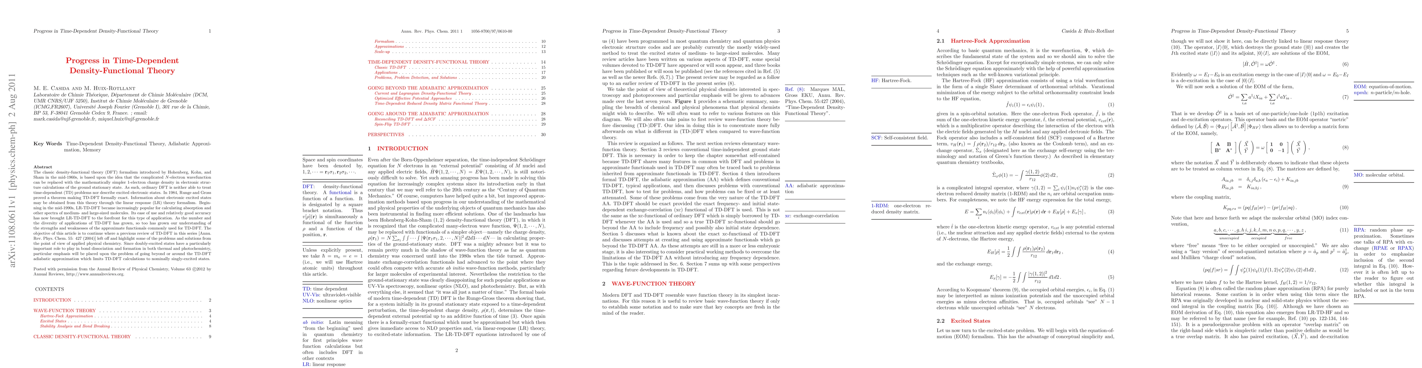 This paper reviews advancements in time-dependent density-functional theory (TD-DFT) since its mid-1990s rise in popularity, focusing on its applications in calculating absorption spectra and addressing its limitations, particularly the adiabatic approximation for doubly-excited states in photochemical processes.