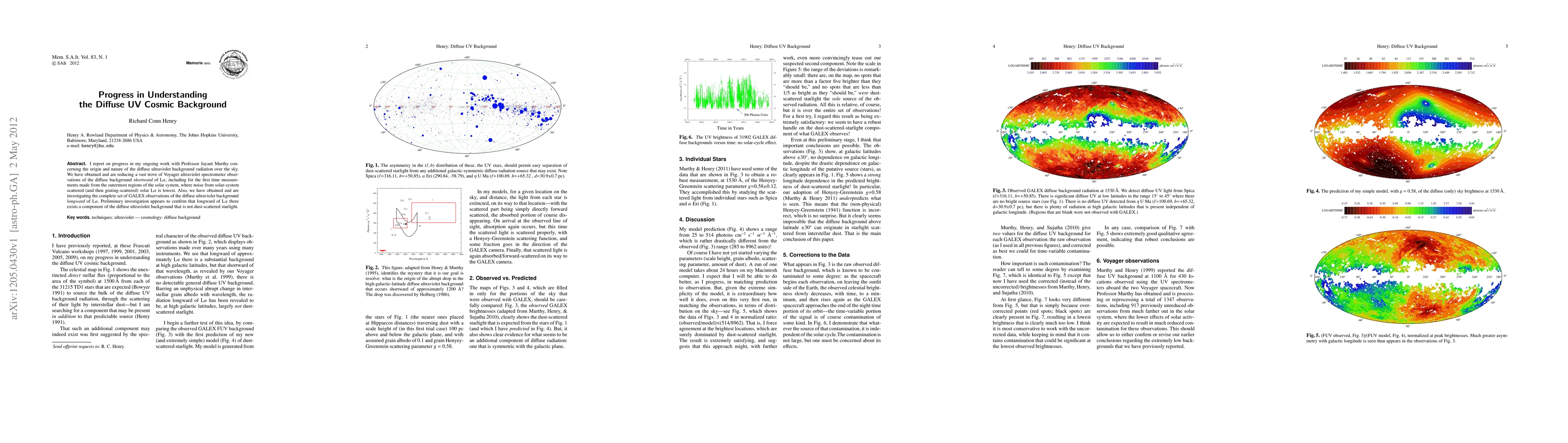 I report on progress in my ongoing work with Professor Jayant Murthy concerning the origin and nature of the diffuse ultraviolet background radiation over the sky. We have obtained and are reducing a vast trove of Voyager ultraviolet spectrometer observations of the diffuse background shortward of Lyman alpha, including for the first time measurements made from the outermost regions of the solar system, where noise from solar-system scattered (and then grating-scattered) solar Lyman alpha is lowest. Also, we have obtained and are investigating the complete set of GALEX observations of the diffuse ultraviolet background longward of Lyman alpha. Preliminary investigation appears to confirm that longward of Lyman alpha there exists a component of the diffuse ultraviolet background that is not dust-scattered starlight.