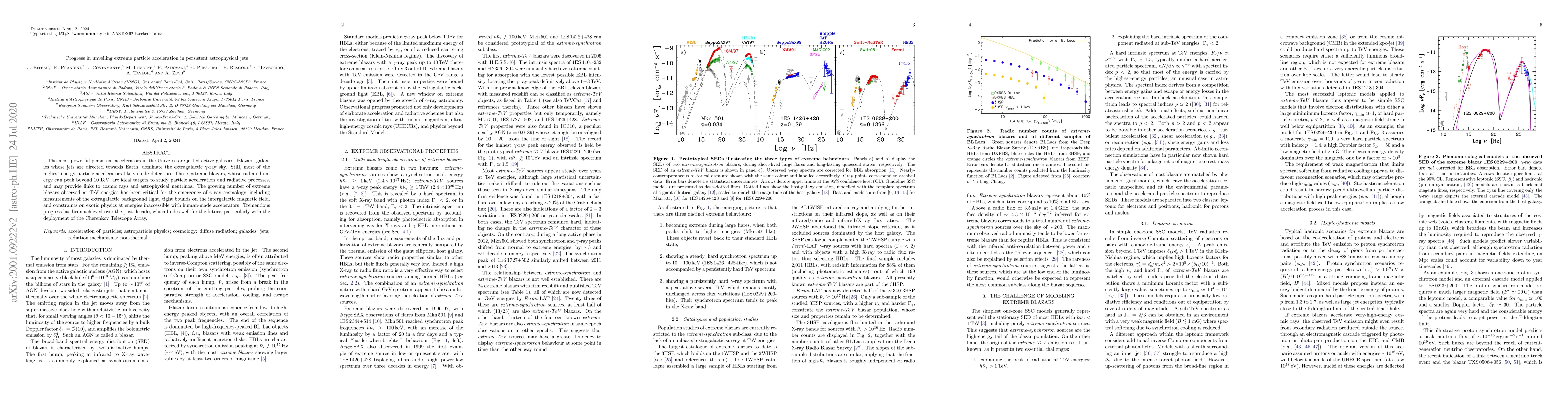 The most powerful persistent accelerators in the Universe are jetted active galaxies. Blazars, galaxies whose jets are directed towards Earth, dominate the extragalactic gamma-ray sky. Still, most of the highest-energy particle accelerators likely elude detection. These extreme blazars, whose radiated energy can peak beyond 10 TeV, are ideal targets to study particle acceleration and radiative processes, and may provide links to cosmic rays and astrophysical neutrinos. The growing number of extreme blazars observed at TeV energies has been critical for the emergence of gamma-ray cosmology, including measurements of the extragalactic background light, tight bounds on the intergalactic magnetic field, and constraints on exotic physics at energies inaccessible with human-made accelerators. Tremendous progress has been achieved over the past decade, which bodes well for the future, particularly with the deployment of the Cherenkov Telescope Array.