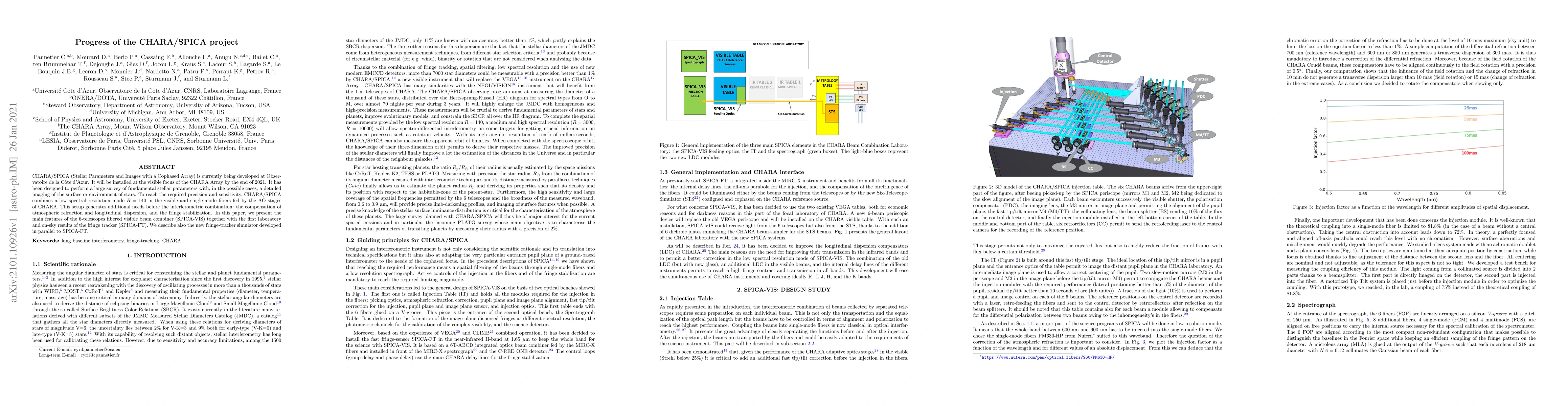 The CHARA/SPICA project aims to survey stellar parameters and image star surfaces using a visible beam combiner and fringe tracker. Initial results from the SPICA-VIS and SPICA-FT components show promising performance in compensating atmospheric effects and stabilizing fringes.