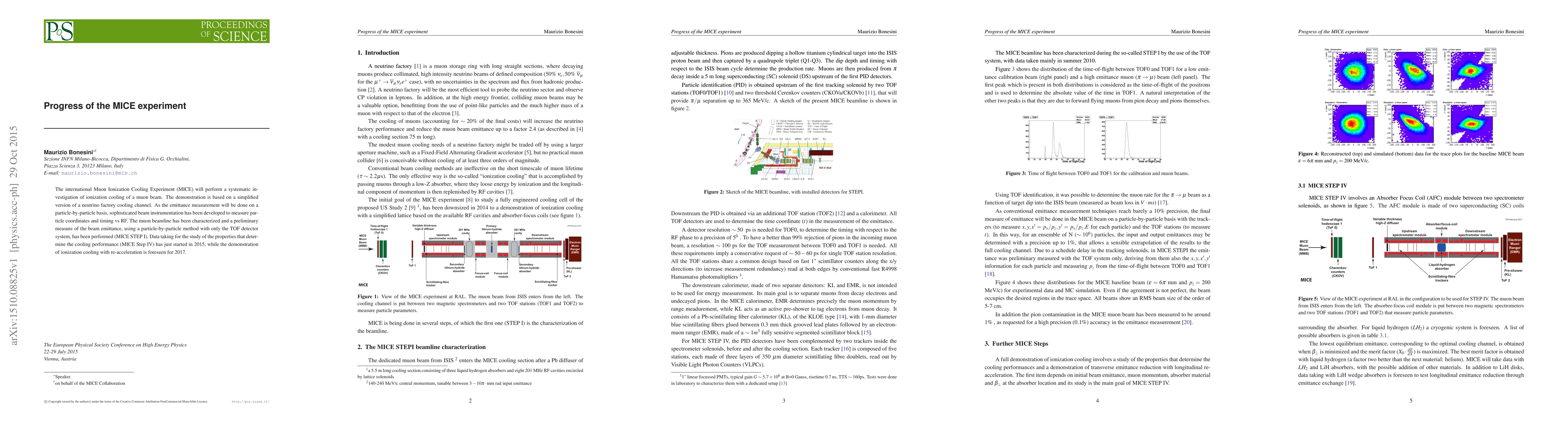 The international Muon Ionization Cooling Experiment (MICE) will perform a systematic investigation of ionization cooling of a muon beam. The demonstration is based on a simplified version of a neutrino factory cooling channel. As the emittance measurement will be done on a particle-by-particle basis, sophisticated beam instrumentation has been developed to measure particle coordinates and timing vs RF. The muon beamline has been characterized and a preliminary measure of the beam emittance, using a particle-by-particle method with only the TOF detector system, has been performed (MICE STEP I). Data taking for the study of the properties that determine the cooling performance (MICE Step IV) has just started in 2015, while the demonstration of ionization cooling with re-acceleration is foreseen for 2017.