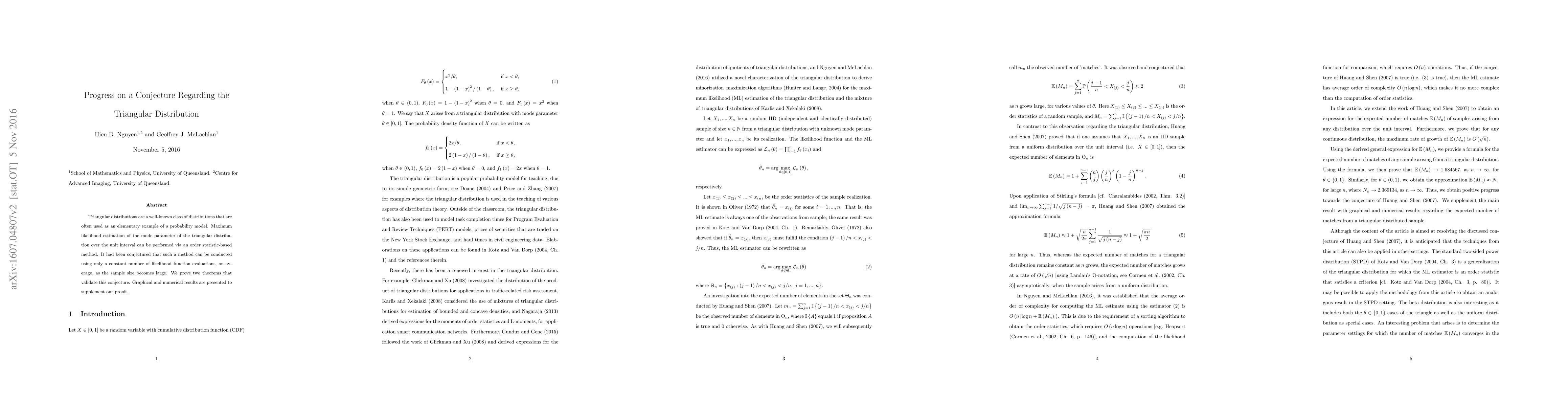 Researchers prove a conjecture about efficient maximum likelihood estimation of triangular distributions, validating that the method requires only a constant number of likelihood function evaluations as sample size increases.