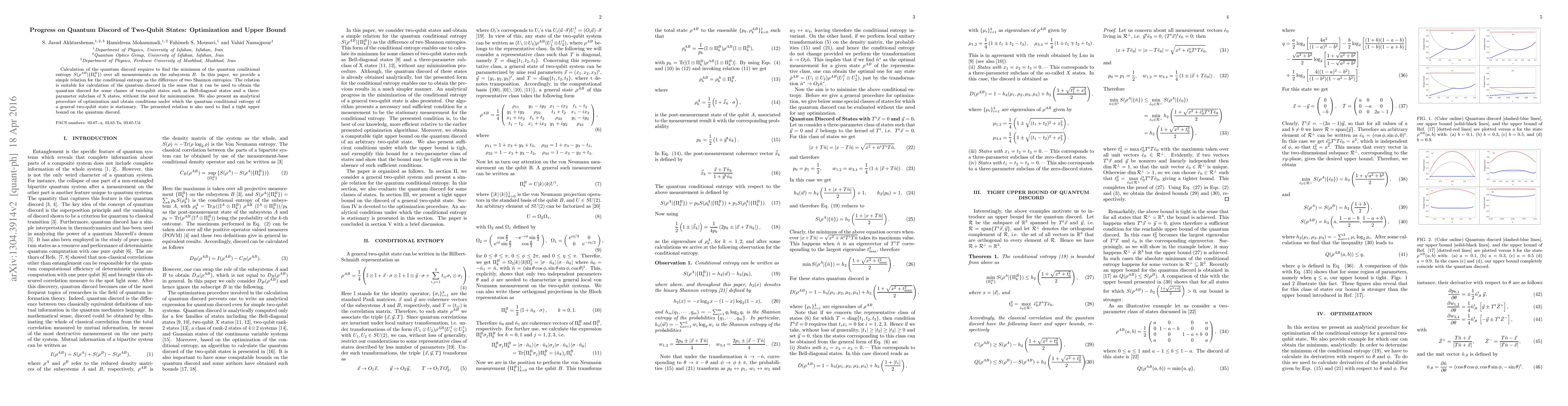 This paper presents a simplified relation for calculating quantum discord in two-qubit states by expressing the quantum conditional entropy as the difference of two Shannon entropies, eliminating the need for minimization. It also provides an analytical procedure for optimization and establishes conditions for the stationary quantum conditional entropy, along with a tight upper bound on quantum discord.