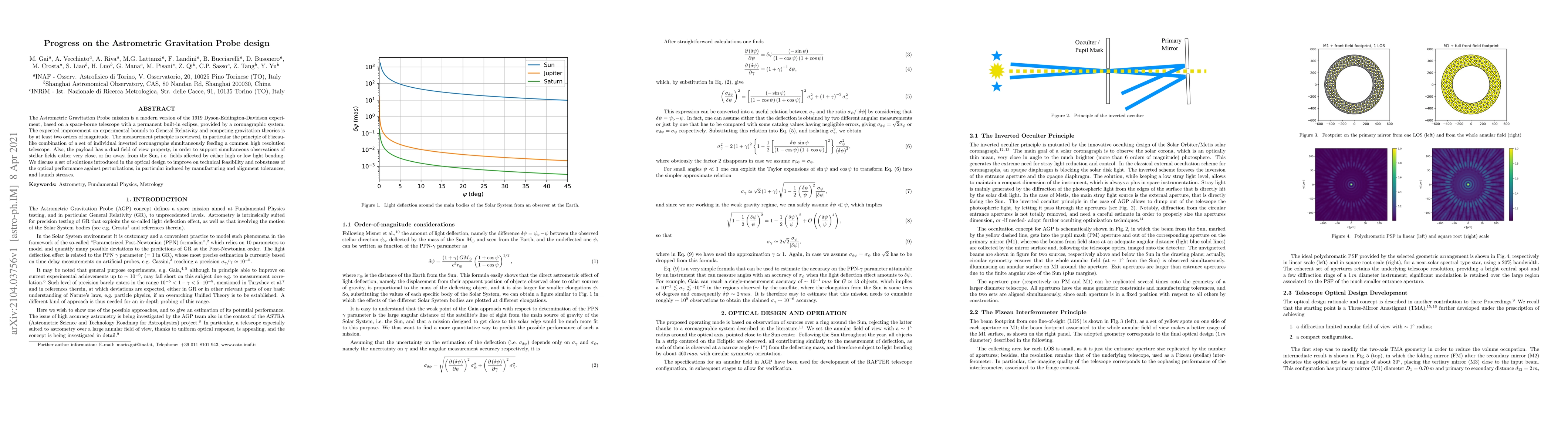 The Astrometric Gravitation Probe mission is a modern version of the 1919 Dyson-Eddington-Davidson experiment, based on a space-borne telescope with a permanent built-in eclipse, provided by a coronagraphic system. The expected improvement on experimental bounds to General Relativity and competing gravitation theories is by at least two orders of magnitude. The measurement principle is reviewed, in particular the principle of Fizeau-like combination of a set of individual inverted coronagraphs simultaneously feeding a common high resolution telescope. Also, the payload has a dual field of view property, in order to support simultaneous observations of stellar fields either very close, or far away, from the Sun, i.e. fields affected by either high or low light bending. We discuss a set of solutions introduced in the optical design to improve on technical feasibility and robustness of the optical performance against perturbations, in particular induced by manufacturing and alignment tolerances, and launch stresses.