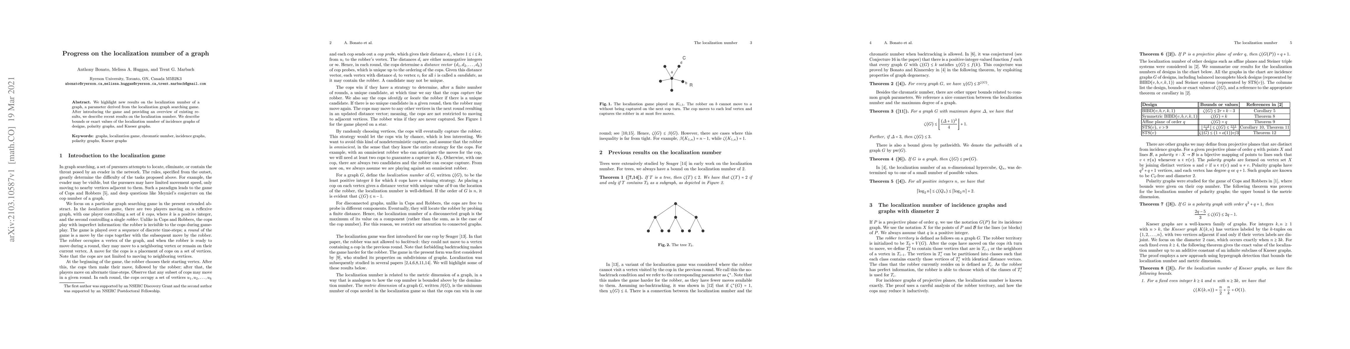We highlight new results on the localization number of a graph, a parameter derived from the localization graph searching game. After introducing the game and providing an overview of existing results, we describe recent results on the localization number. We describe bounds or exact values of the localization number of incidence graphs of designs, polarity graphs, and Kneser graphs.