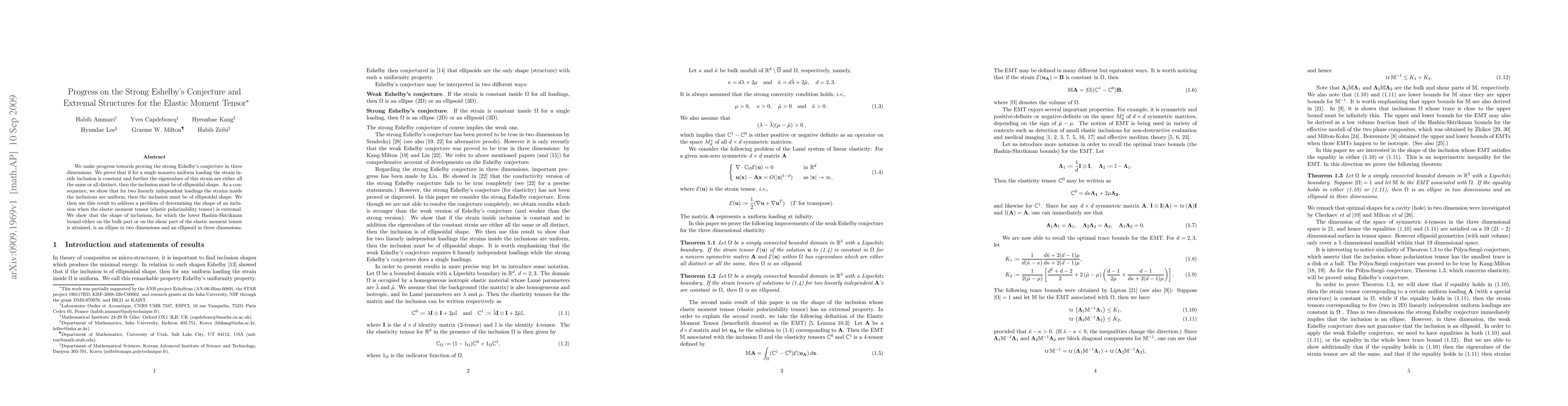 We make progress towards proving the strong Eshelby's conjecture in three dimensions. We prove that if for a single nonzero uniform loading the strain inside inclusion is constant and further the eigenvalues of this strain are either all the same or all distinct, then the inclusion must be of ellipsoidal shape. As a consequence, we show that for two linearly independent loadings the strains inside the inclusions are uniform, then the inclusion must be of ellipsoidal shape. We then use this result to address a problem of determining the shape of an inclusion when the elastic moment tensor (elastic polarizability tensor) is extremal. We show that the shape of inclusions, for which the lower Hashin-Shtrikman bound either on the bulk part or on the shear part of the elastic moment tensor is attained, is an ellipse in two dimensions and an ellipsoid in three dimensions.