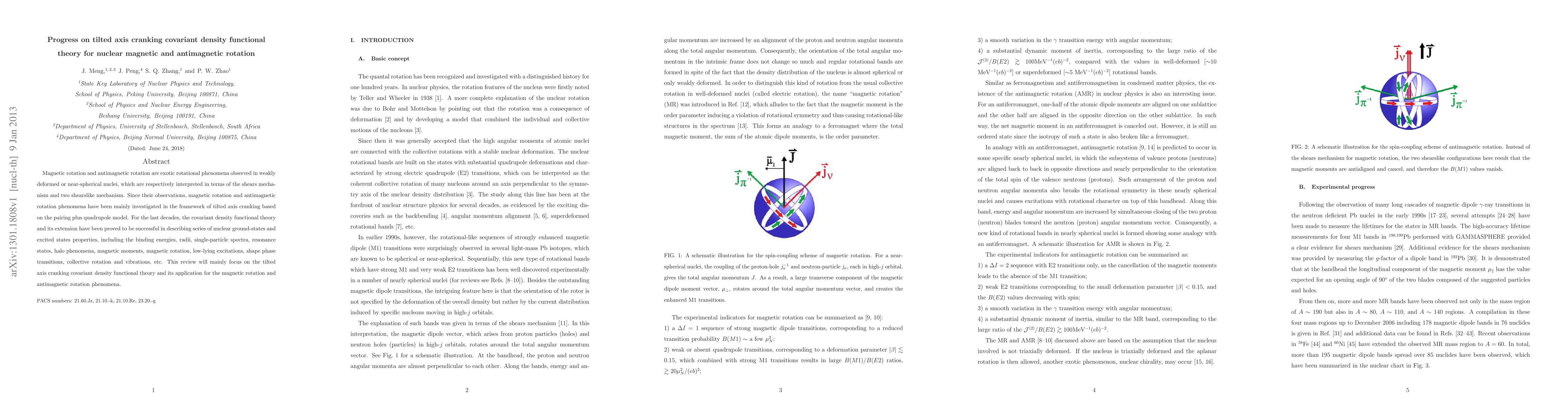 This paper reviews the progress in applying tilted axis cranking covariant density functional theory to describe magnetic and antimagnetic rotation phenomena in weakly deformed or near-spherical nuclei, highlighting the theory's success in modeling various nuclear properties and rotational dynamics.