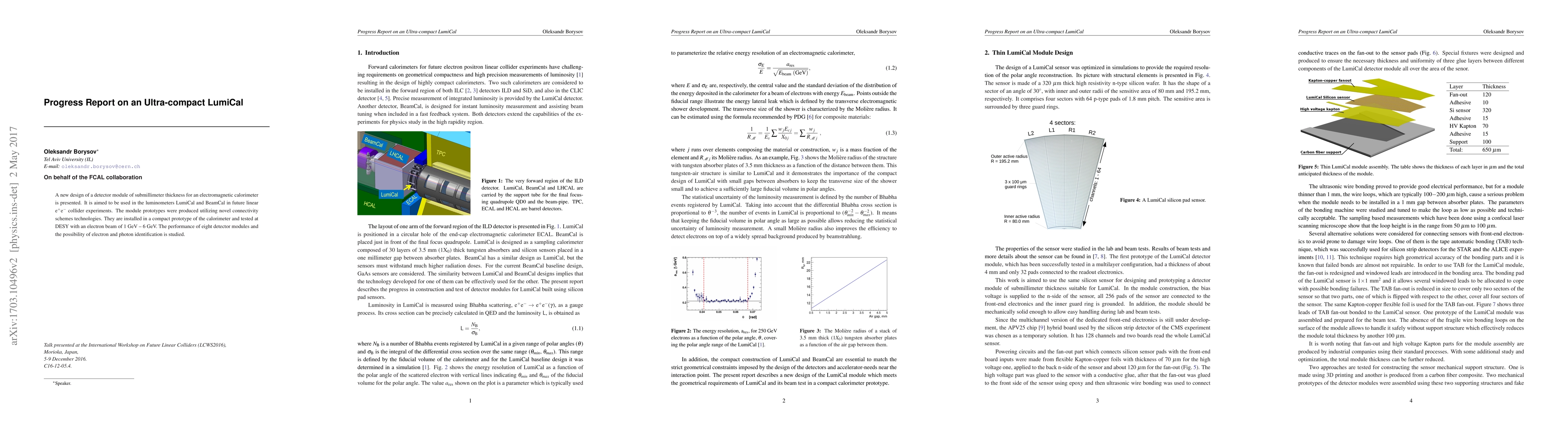 A new design of a detector module of submillimeter thickness for an electromagnetic calorimeter is presented. It is aimed to be used in the luminometers LumiCal and BeamCal in future linear e$^{+}$e$^{-}$ collider experiments. The module prototypes were produced utilizing novel connectivity schemes technologies. They are installed in a compact prototype of the calorimeter and tested at DESY with an electron beam of 1 GeV $-$ 6 GeV. The performance of eight detector modules and the possibility of electron and photon identification is studied.