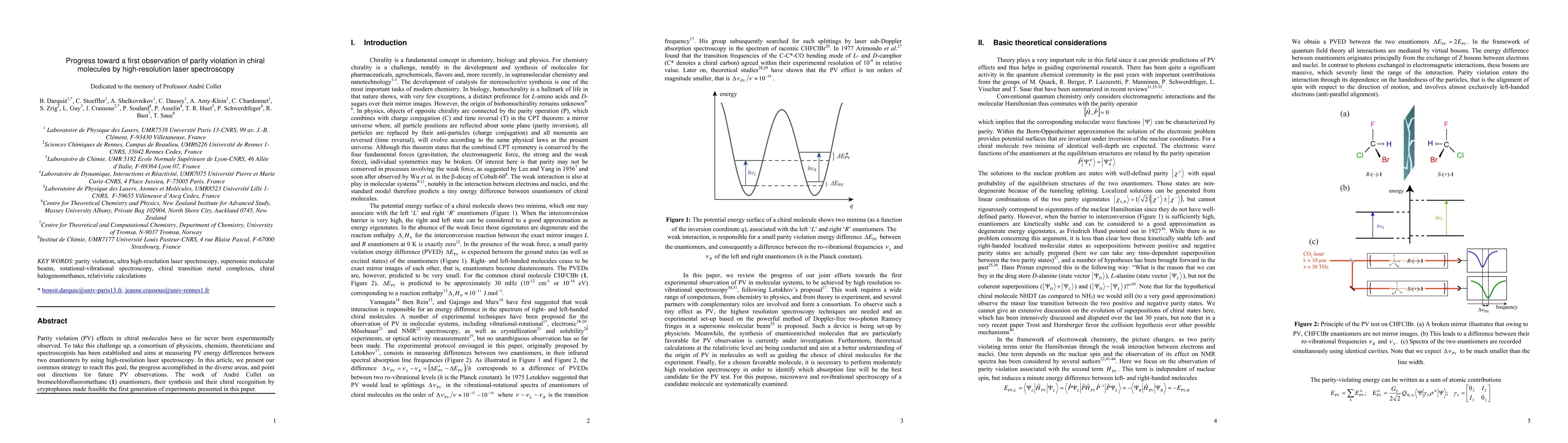 This paper outlines a collaborative effort to observe parity violation in chiral molecules using high-resolution laser spectroscopy, detailing the strategy, progress made, and future directions. The work on bromochlorofluoromethane enantiomers by André Collet has enabled initial experimental steps towards this goal.