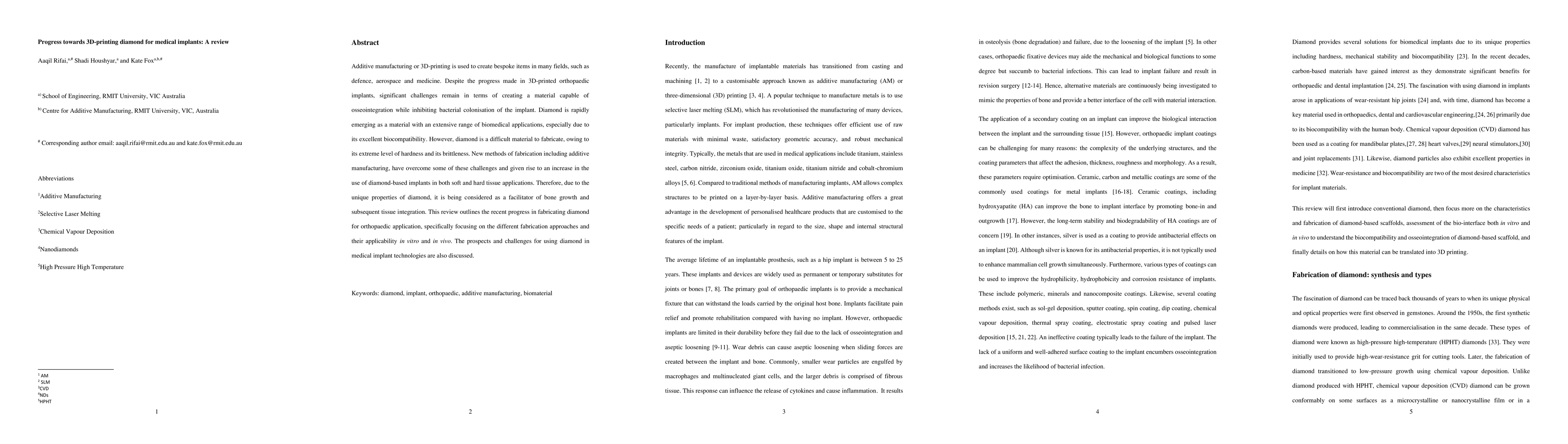 This review examines recent advancements in 3D-printing diamond for medical implants, highlighting the material's biocompatibility and potential for osseointegration. It discusses various fabrication methods and their effectiveness for orthopaedic applications, while also addressing the challenges and future prospects of using diamond in medical implant technologies.