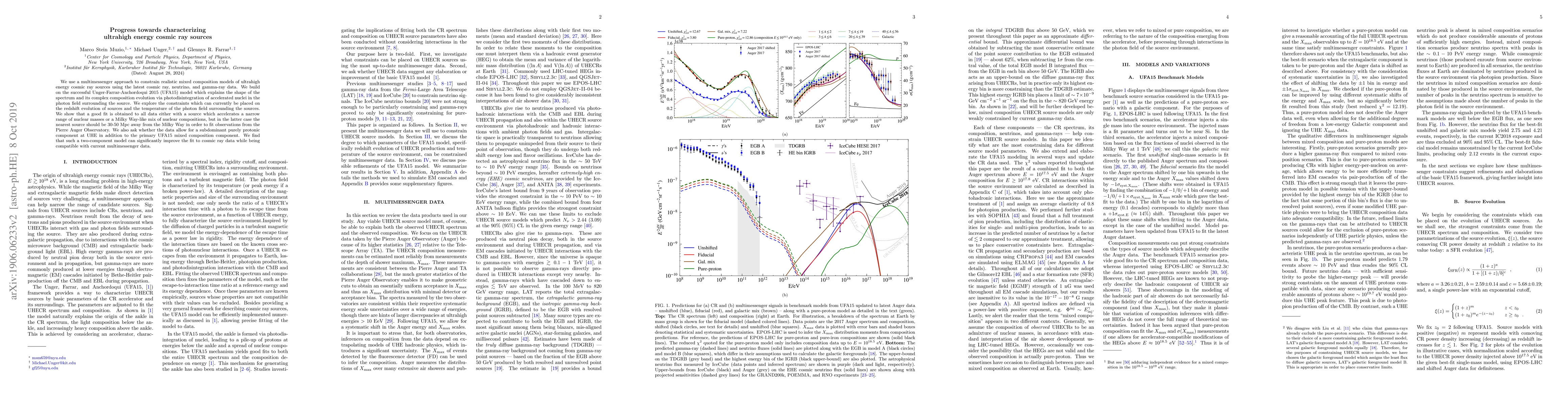 We use a multimessenger approach to constrain realistic mixed composition models of ultrahigh energy cosmic ray sources using the latest cosmic ray, neutrino, and gamma-ray data. We build on the successful Unger-Farrar-Anchordoqui 2015 (UFA15) model which explains the shape of the spectrum and its complex composition evolution via photodisintegration of accelerated nuclei in the photon field surrounding the source. We explore the constraints which can currently be placed on the redshift evolution of sources and the temperature of the photon field surrounding the sources. We show that a good fit is obtained to all data either with a source which accelerates a narrow range of nuclear masses or a Milky Way-like mix of nuclear compositions, but in the latter case the nearest source should be 30-50 Mpc away from the Milky Way in order to fit observations from the Pierre Auger Observatory. We also ask whether the data allow for a subdominant purely protonic component at UHE in addition to the primary UFA15 mixed composition component. We find that such a two-component model can significantly improve the fit to cosmic ray data while being compatible with current multimessenger data.