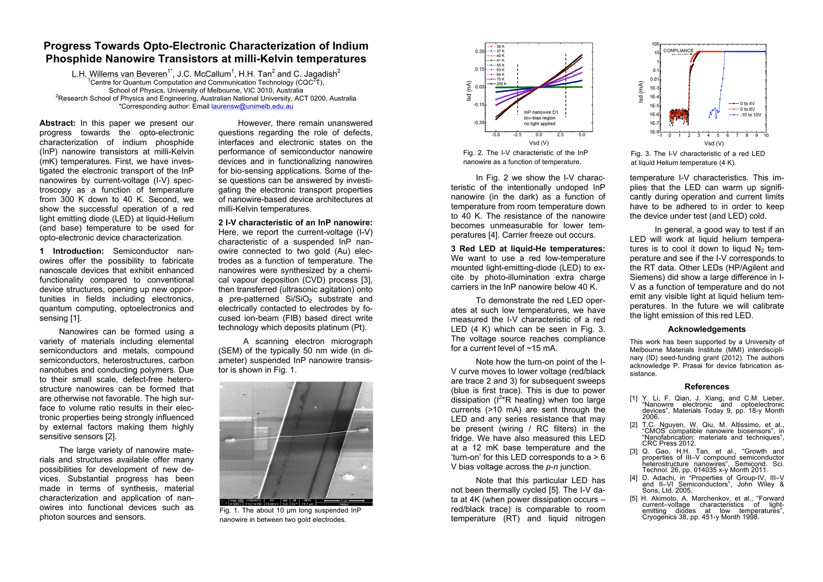 This paper reports advancements in the opto-electronic characterization of indium phosphide nanowire transistors at milli-Kelvin temperatures, including electronic transport studies via I-V spectroscopy and the operation of a red LED at low temperatures for device characterization.