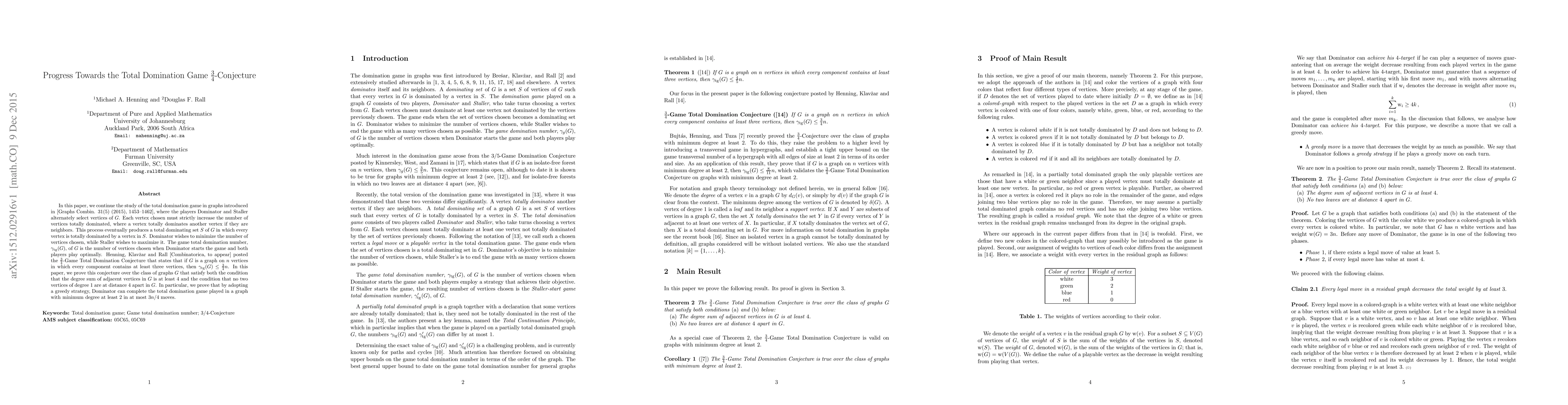 This paper explores the total domination game in graphs, focusing on proving the $\frac{3}{4}$-Game Total Domination Conjecture for specific graph classes. It demonstrates that Dominator can minimize the number of moves to achieve total domination in graphs with minimum degree at least 2, using a greedy strategy.