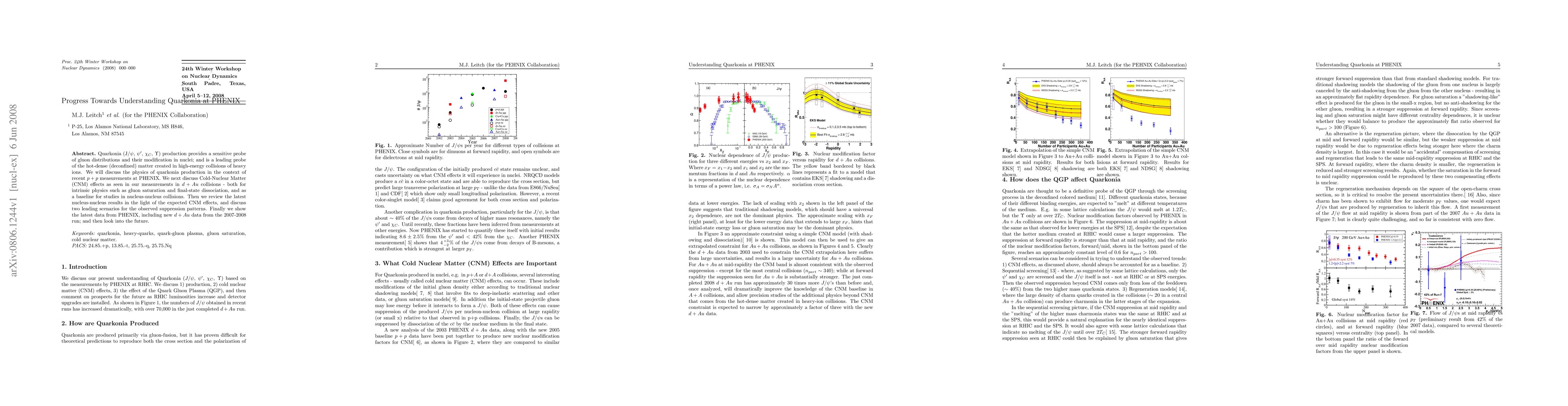 Quarkonia (J/psi, psi', chi_C, Upsilon) production provides a sensitive probe of gluon distributions and their modification in nuclei; and is a leading probe of the hot-dense (deconfined) matter created in high-energy collisions of heavy ions. We will discuss the physics of quarkonia production in the context of recent p+p measurements at PHENIX. We next discuss Cold-Nuclear Matter (CNM) effects as seen in our measurements in $d+Au$ collisions - both for intrinsic physics such as gluon saturation and final-state dissociation, and as a baseline for studies in nucleus-nucleus collisions. Then we review the latest nucleus-nucleus results in the light of the expected CNM effects, and discuss two leading scenarios for the observed suppression patterns. Finally we show the latest data from PHENIX, including new d+Au data from the 2007-2008 run; and then look into the future.