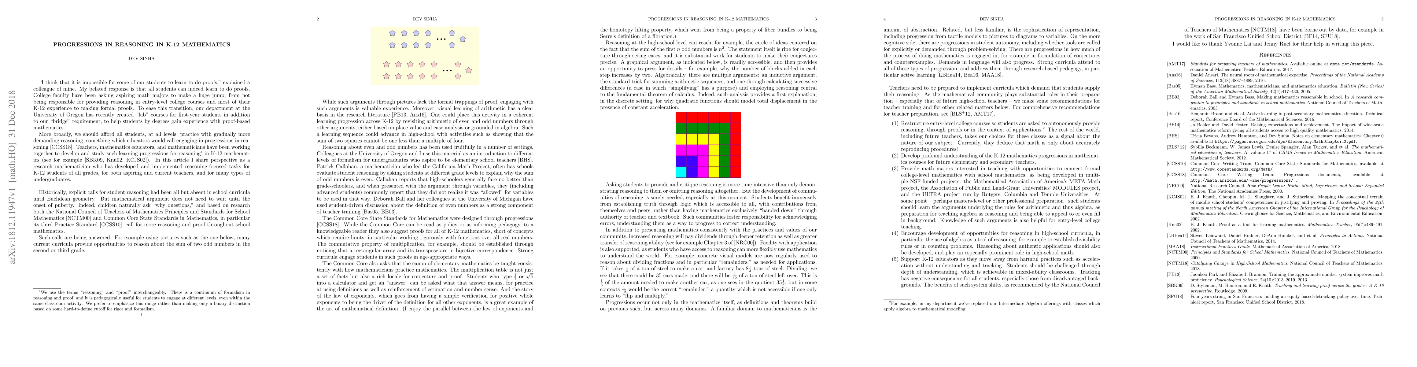We present a research mathematician's perspective on current developments around in K-12 mathematics. We share activities, and highlight the different ways in which students' reasoning can progress, such as amount of abstraction, sophistication of representation, amount of autonomy and use of language. We end with recommendations for college and university faculty to support greater development of student reasoning in K-12.