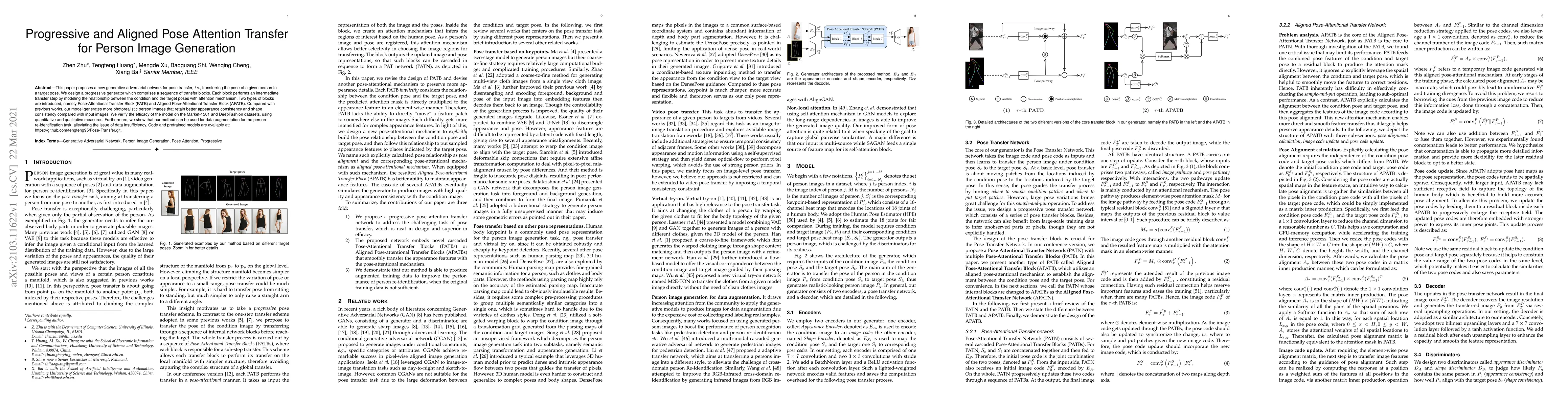 This paper introduces a new GAN for pose transfer that uses progressive and aligned pose attention blocks to generate more realistic person images with better consistency. The model is validated on Market-1501 and DeepFashion datasets and shown to improve person re-identification data augmentation.
