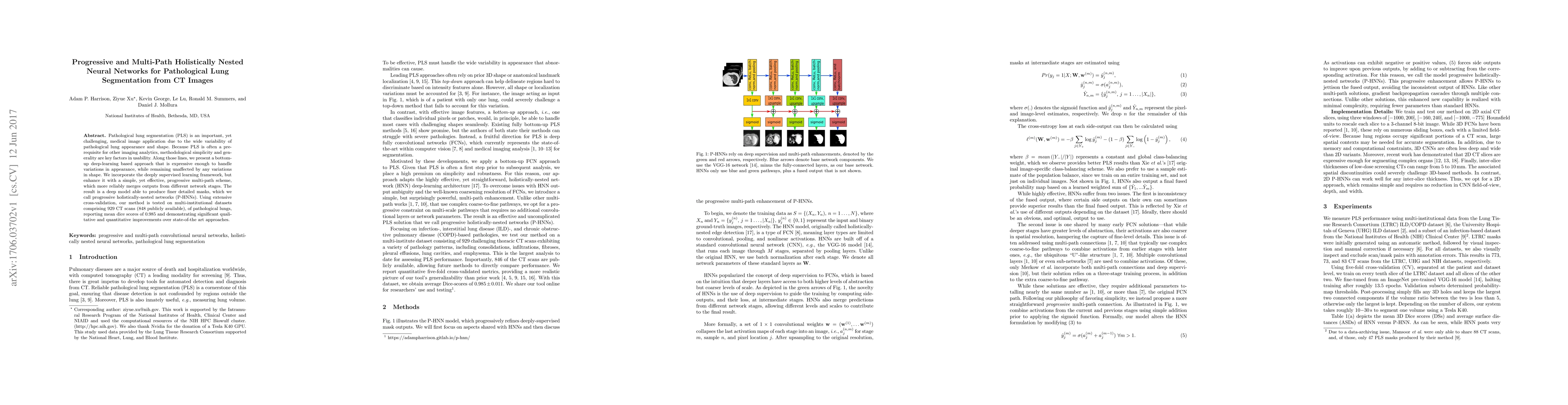 This paper presents progressive and multi-path holistically nested neural networks (P-HNNs) for pathological lung segmentation from CT images, achieving mean dice scores of 0.985 through extensive cross-validation on 929 CT scans, demonstrating superior performance over existing methods.