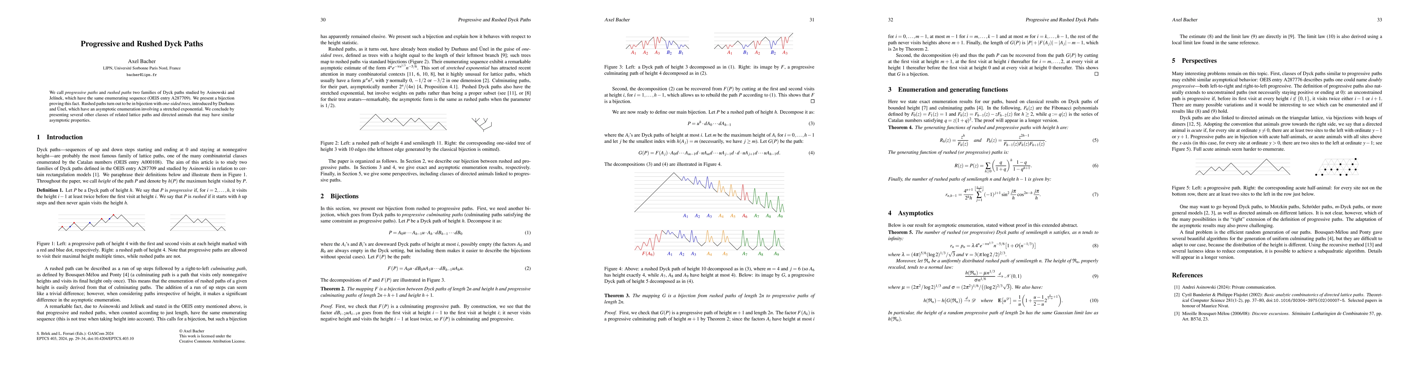 The paper establishes a bijection proving the equivalence in enumerating sequences between progressive and rushed Dyck paths, linking rushed paths to one-sided trees with stretched exponential asymptotic enumeration. It also discusses related classes of lattice paths and directed animals with potential similar properties.