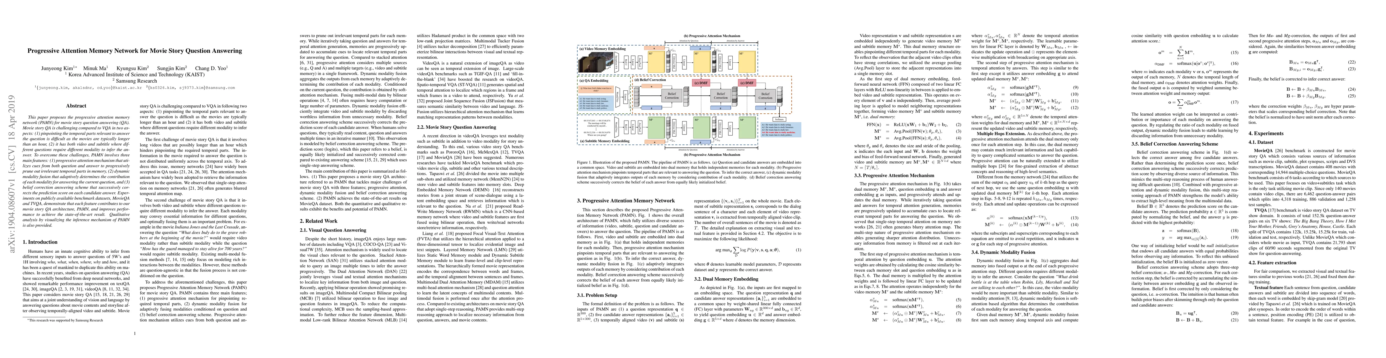 The paper introduces the Progressive Attention Memory Network (PAMN) for movie story question answering, addressing the challenges of temporal relevance and modality fusion. It achieves state-of-the-art results through progressive attention, dynamic modality fusion, and belief correction, as demonstrated by experiments on MovieQA and TVQA datasets.