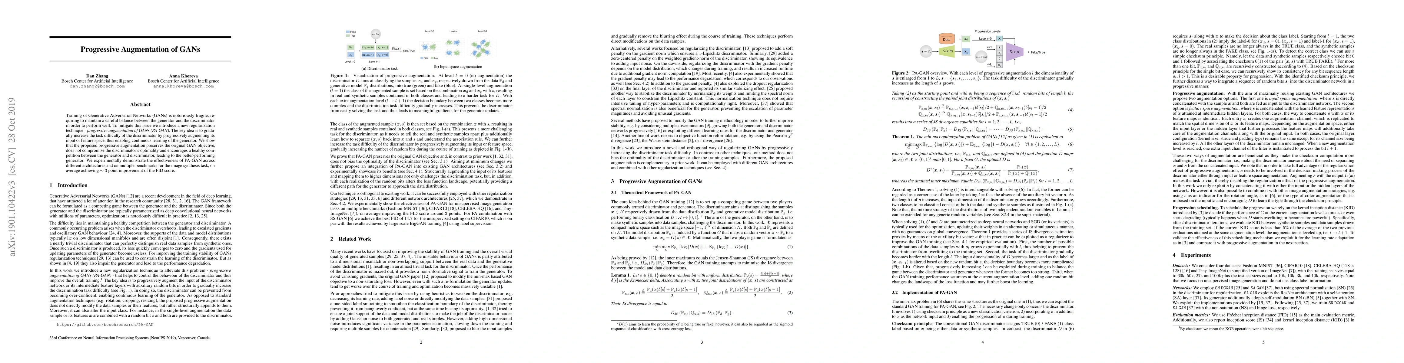 The paper introduces progressive augmentation of GANs (PA-GAN) to stabilize GAN training by gradually increasing the discriminator's difficulty through input or feature space augmentation, which enhances the generator's performance without compromising the discriminator's optimality. Experimental results show an average 3-point improvement in FID scores across various benchmarks.