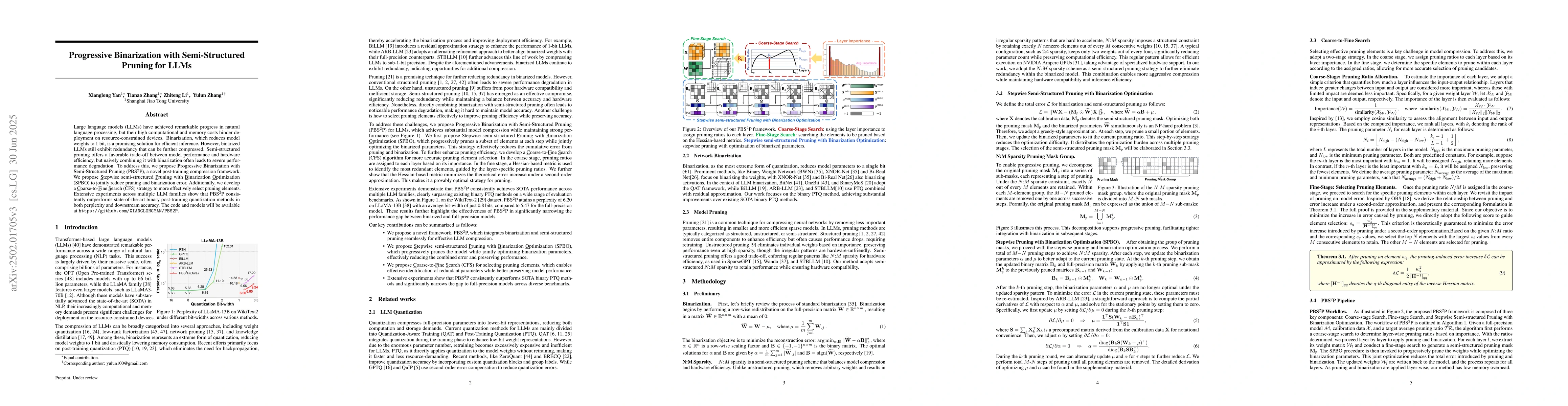 Large language models (LLMs) have achieved remarkable progress in natural language processing, but their high computational and memory costs hinder deployment on resource-constrained devices. Binarization, which reduces model weights to 1 bit, is a promising solution for efficient inference. However, binarized LLMs still exhibit redundancy that can be further compressed. Semi-structured pruning offers a favorable trade-off between model performance and hardware efficiency, but naively combining it with binarization often leads to severe performance degradation. To address this, we propose Progressive Binarization with Semi-Structured Pruning (PBS$^2$P), a novel post-training compression framework. We propose Stepwise semi-structured Pruning with Binarization Optimization (SPBO) to jointly reduce pruning and binarization error. Additionally, we develop a Coarse-to-Fine Search (CFS) strategy to more effectively select pruning elements. Extensive experiments across multiple LLM families show that PBS$^2$P consistently outperforms state-of-the-art binary post-training quantization methods in both perplexity and downstream accuracy. The code and models will be available at: https://github.com/XIANGLONGYAN/PBS2P.