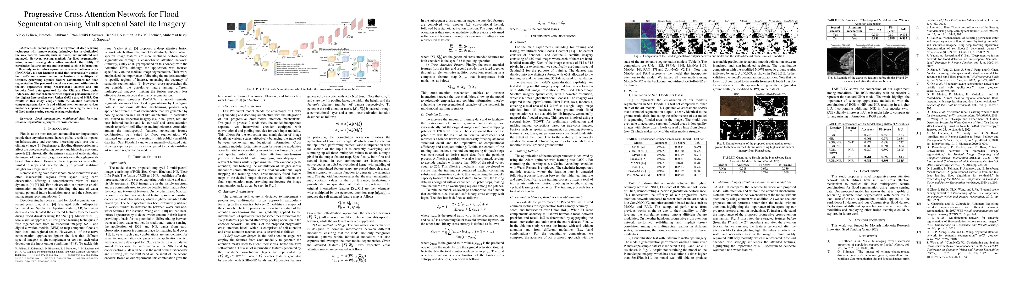 This paper introduces ProCANet, a deep learning model that leverages progressive self- and cross-attention mechanisms to effectively segment floods using multispectral satellite imagery, outperforming existing methods with an IoU score of 0.815. The study demonstrates the enhanced accuracy achievable through the integration of correlative features among multispectral data.