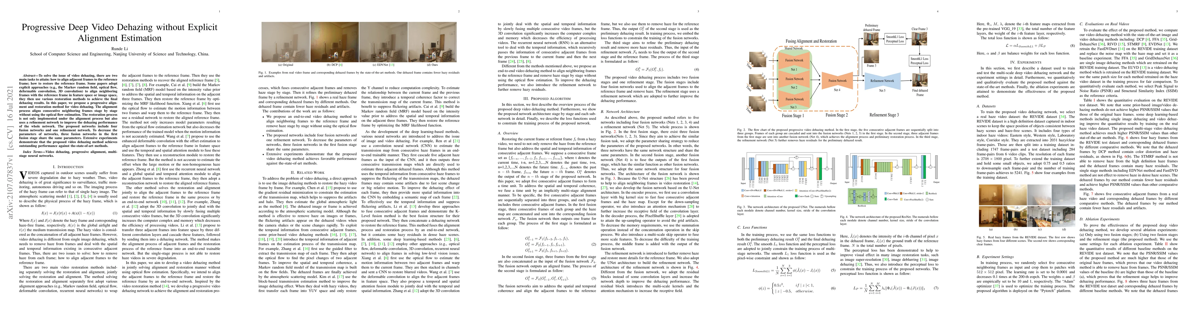 This paper proposes a progressive deep learning method for video dehazing that aligns consecutive frames stage by stage without explicit optical flow estimation, and employs a refinement network to enhance dehazing performance. The method uses shared parameters across three fusion networks to reduce complexity, achieving superior results compared to state-of-the-art techniques.